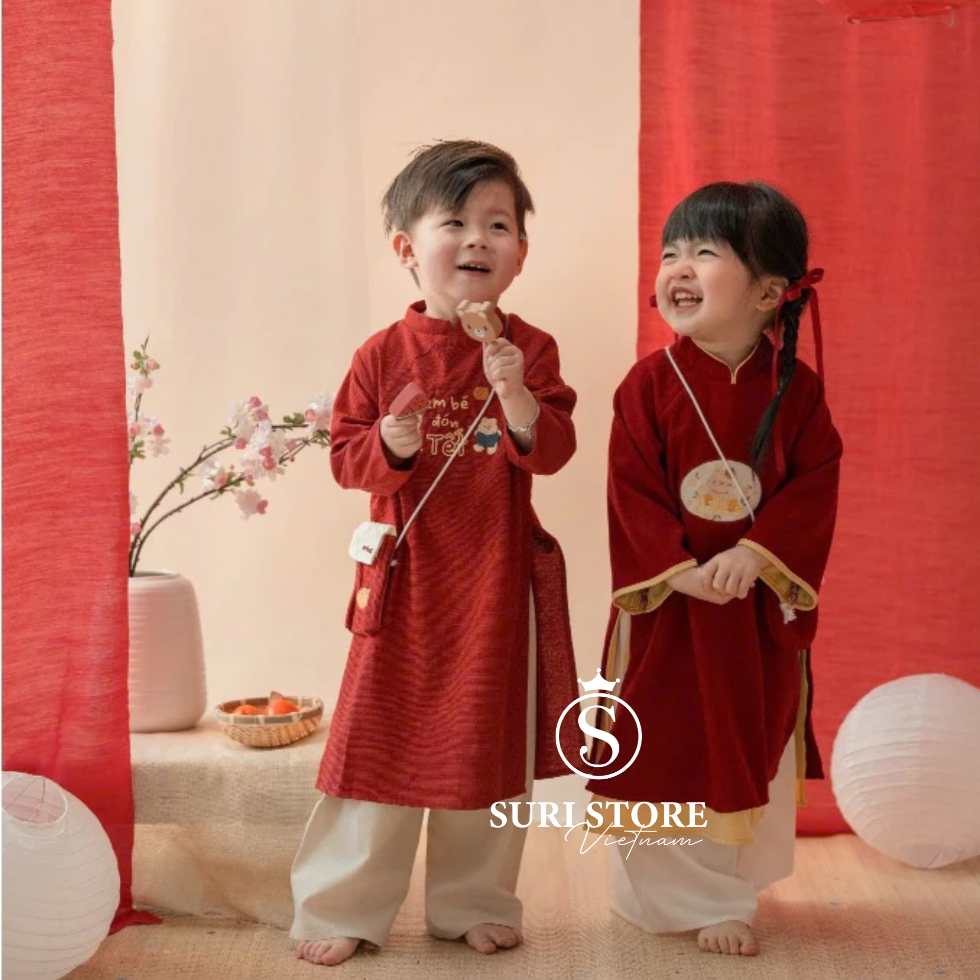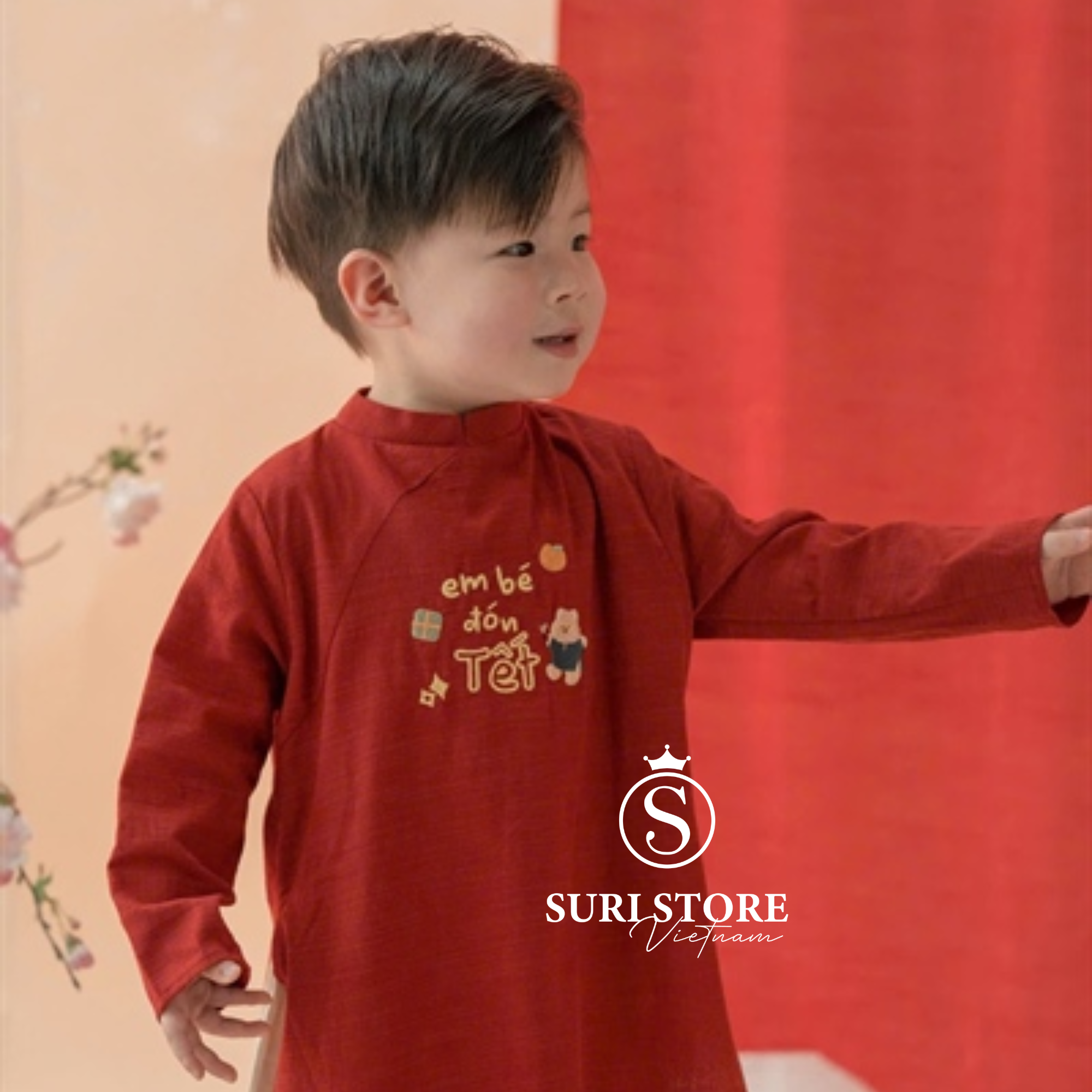 Họa tiết: Thêu chữ "em bé đón Tết" cùng hình minh họa gấu/quả cam đặc trưng của hãng, tạo vẻ ngoài đáng yêu và duyên dáng.