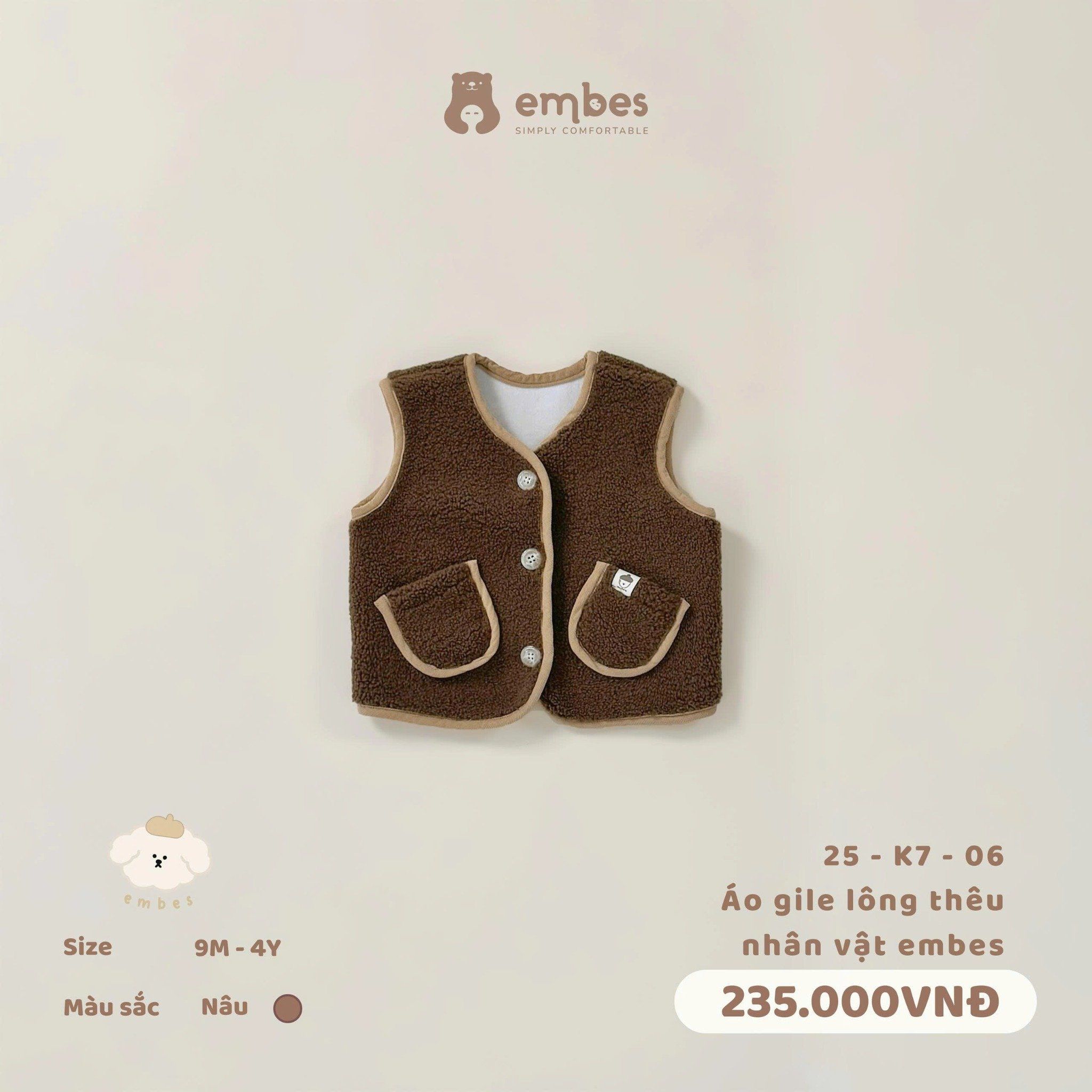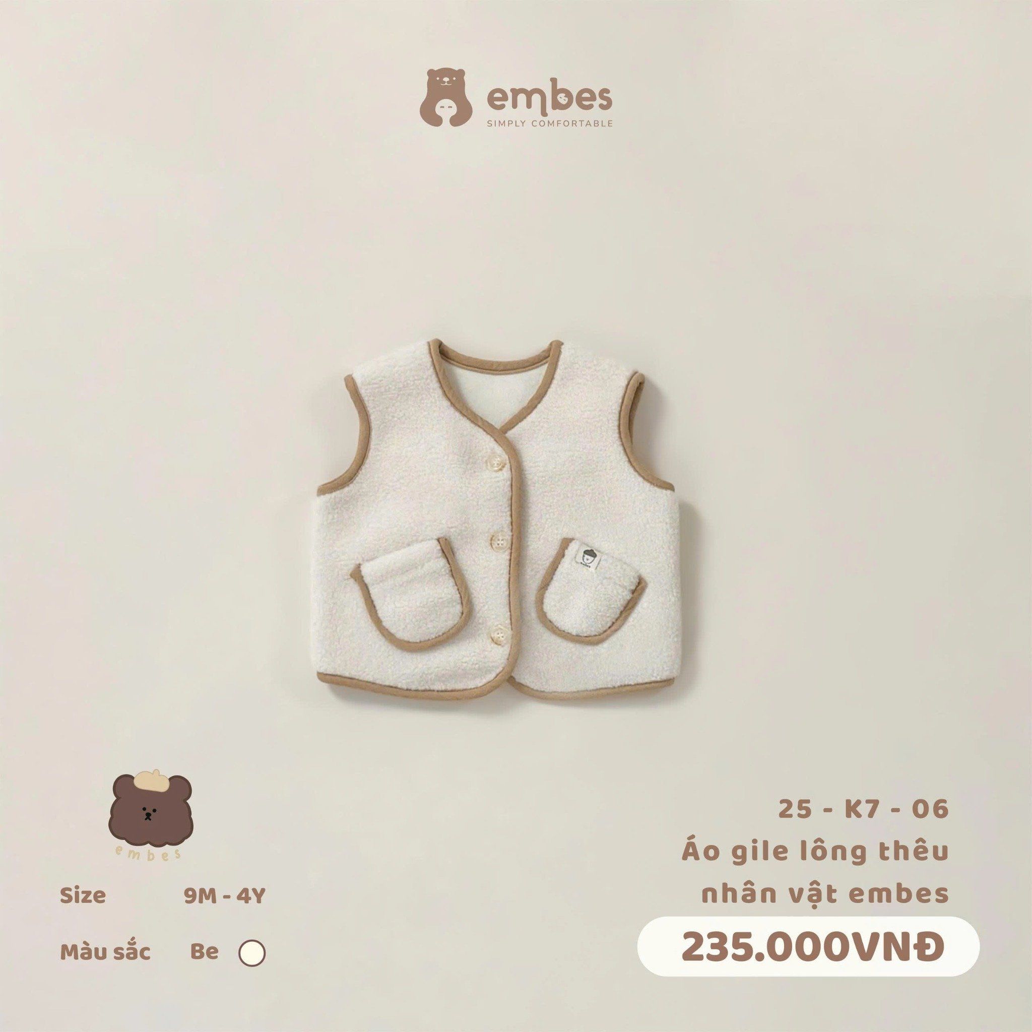 - Tên sản phẩm : Gile Lông Cho Bé Embes, Áo Khoác Gile Thêu Hình Chất Nỉ Lông Mềm Ấm Cho Bé Trai Bé Gái Từ 8-18Kg