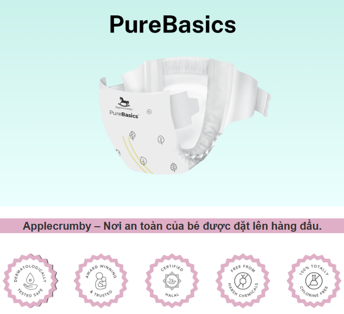 - Thương hiệu Applecrumby được biết đến với các sản phẩm bỉm tã mỏng nhẹ, thấm hút tốt, an toàn cho da bé và có khả năng bảo vệ bé suốt đêm.