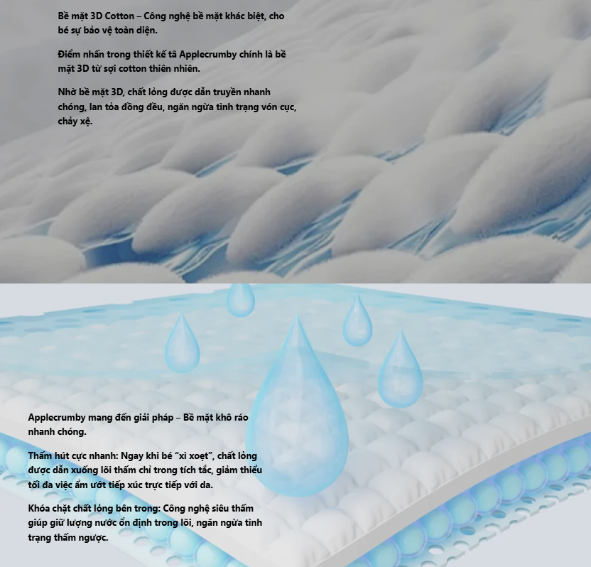 - Applecrumby không chỉ đảm bảo khả năng thấm hút vượt trội, mà còn mang đến cho bé sự thoải mái trong mọi tư thế vận động, từ những bước bò chập chững đến giấc ngủ sâu lành.