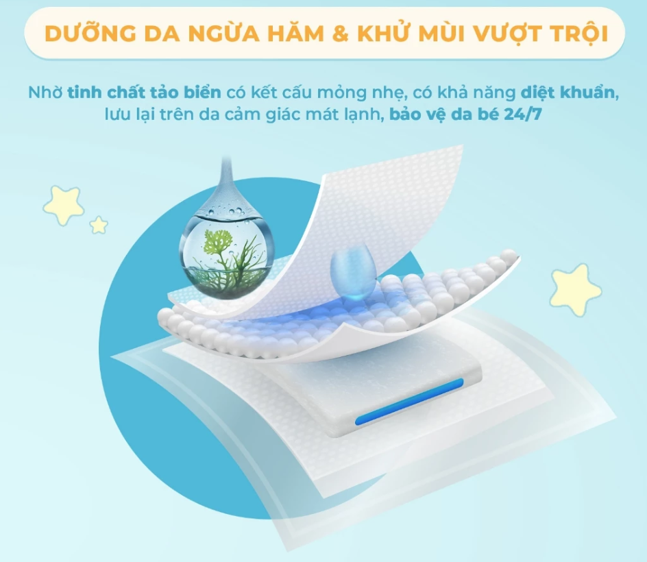 Bỉm chứa tinh chất tảo biển làm mát da, không gây dị ứng, thấm hút tuyệt đối nhờ công nghệ lõi G siêu thấm hút bảo vệ bé khỏi hăm 24/7.