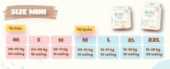 Size và số miếng trong tã bỉm Komii