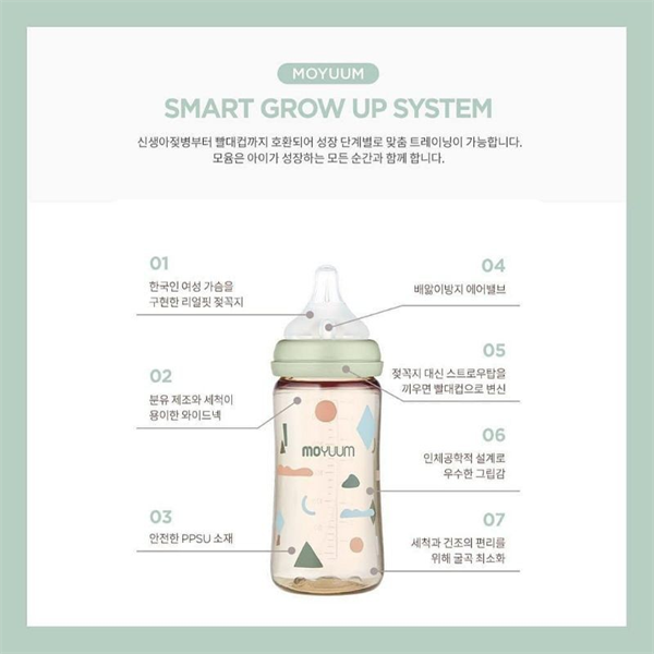 Bình sữa Moyuum PPSU được trang trí bởi họa tiết đáng yêu, đem tới sự thích thú cho bé để con chủ động ty sữa trong bình.