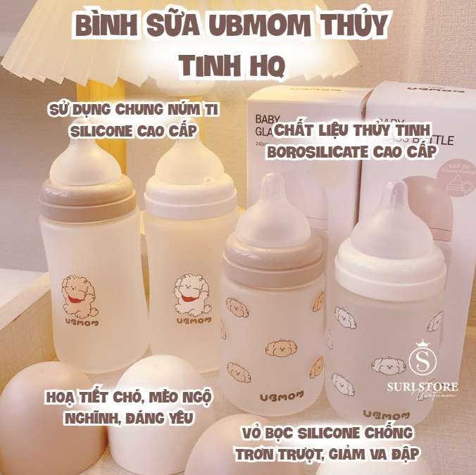 - Bình sữa thủy tinh UBMOM hoạ tiết cún trắng/ nâu – An toàn, mô phỏng ti mẹ
