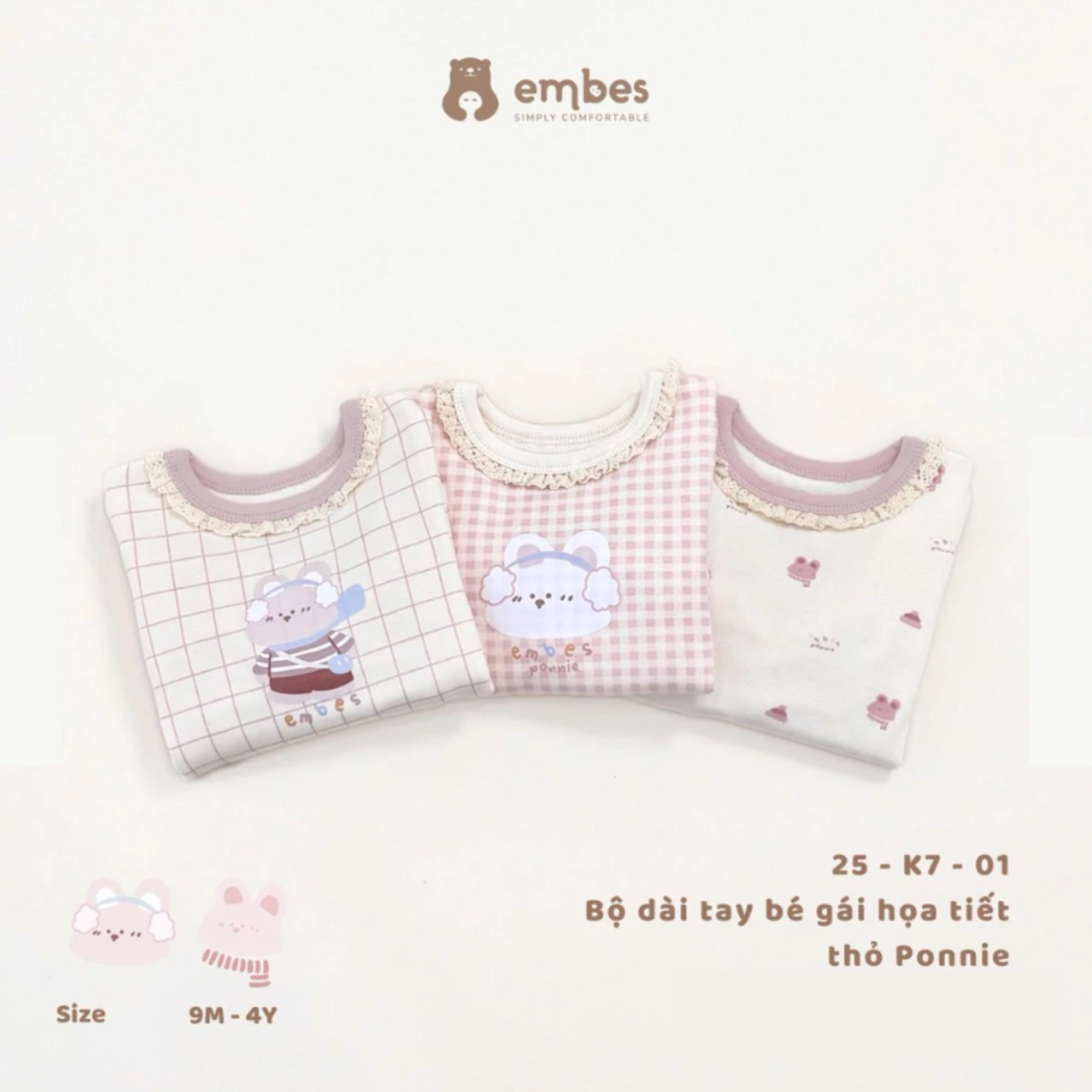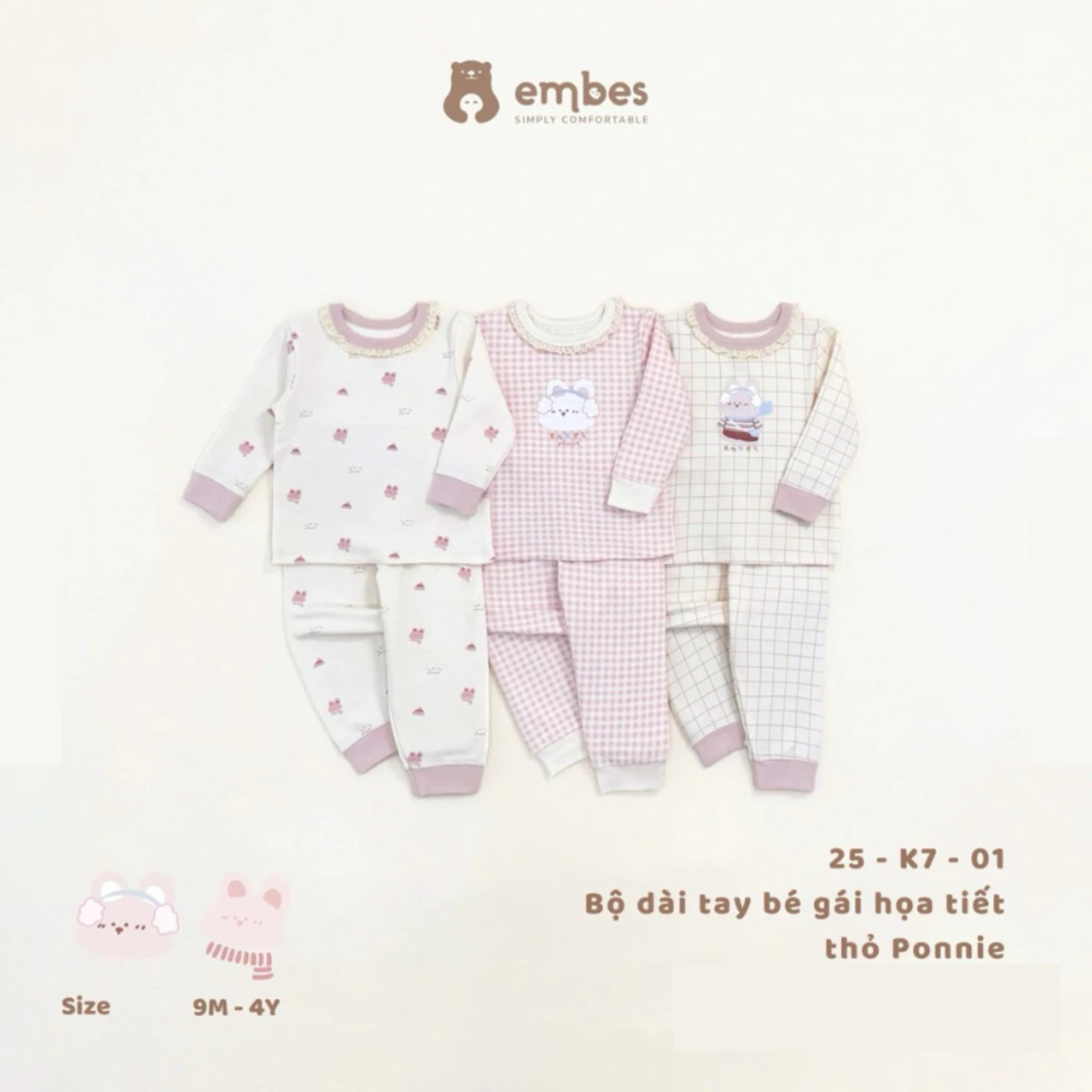 Bộ dài tay bé gái hoạ tiết thỏ Ponnie hồng 25K701 Embes VN
