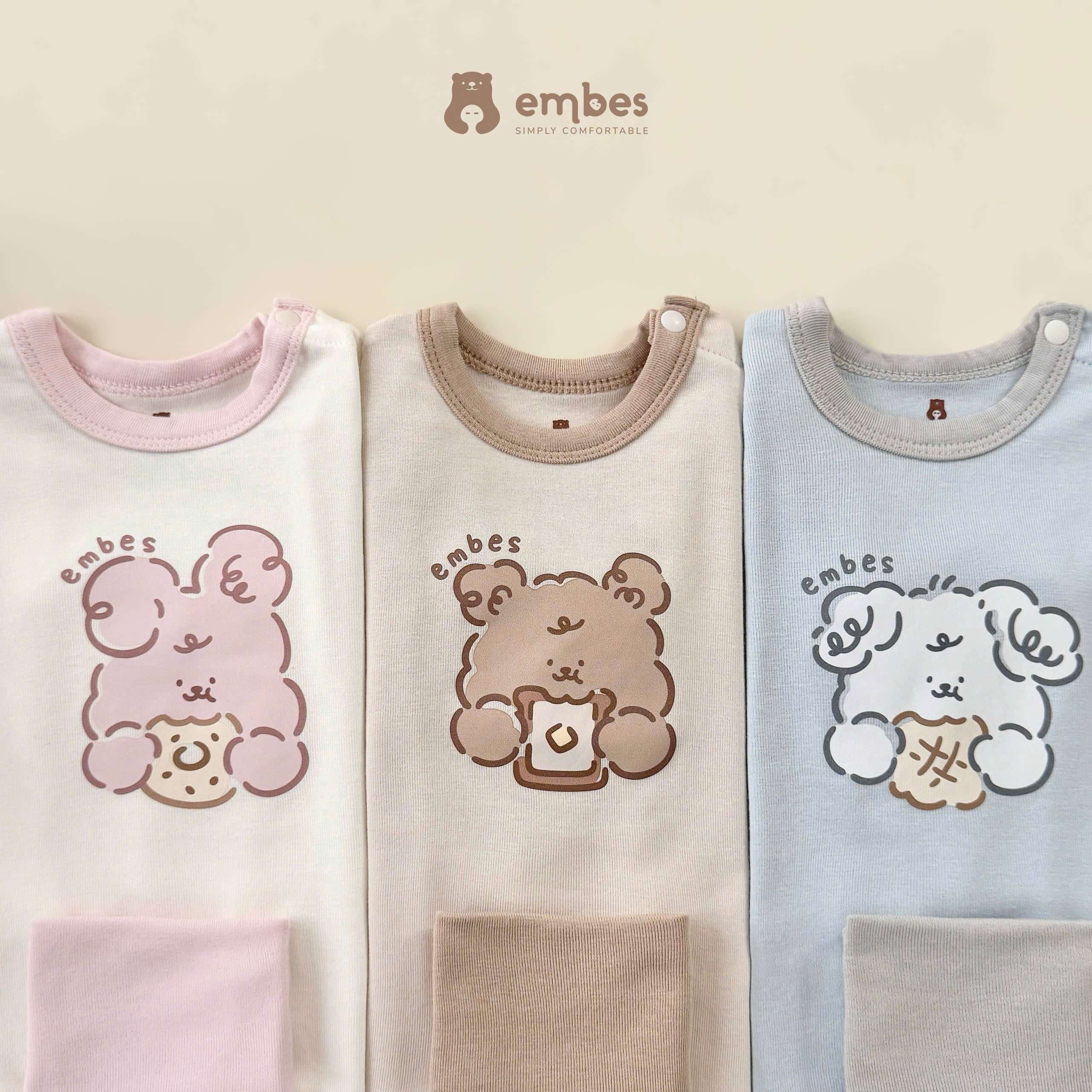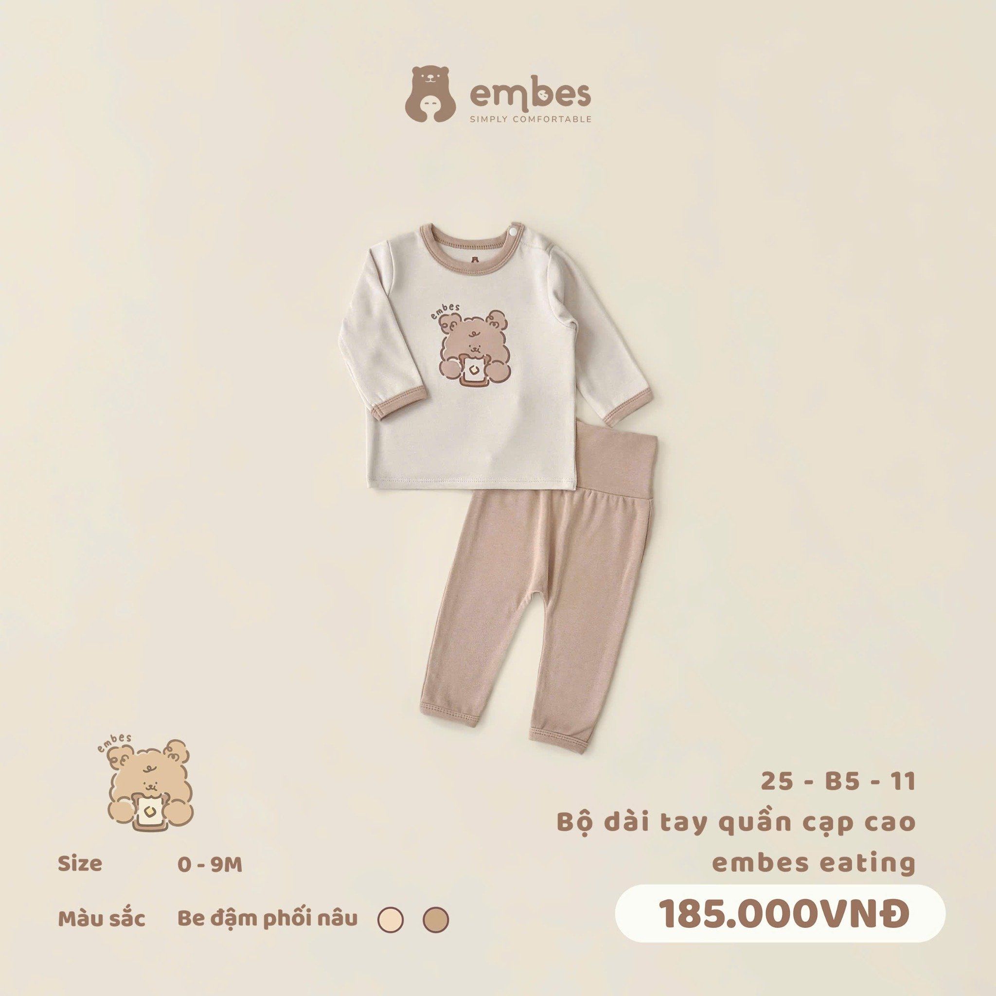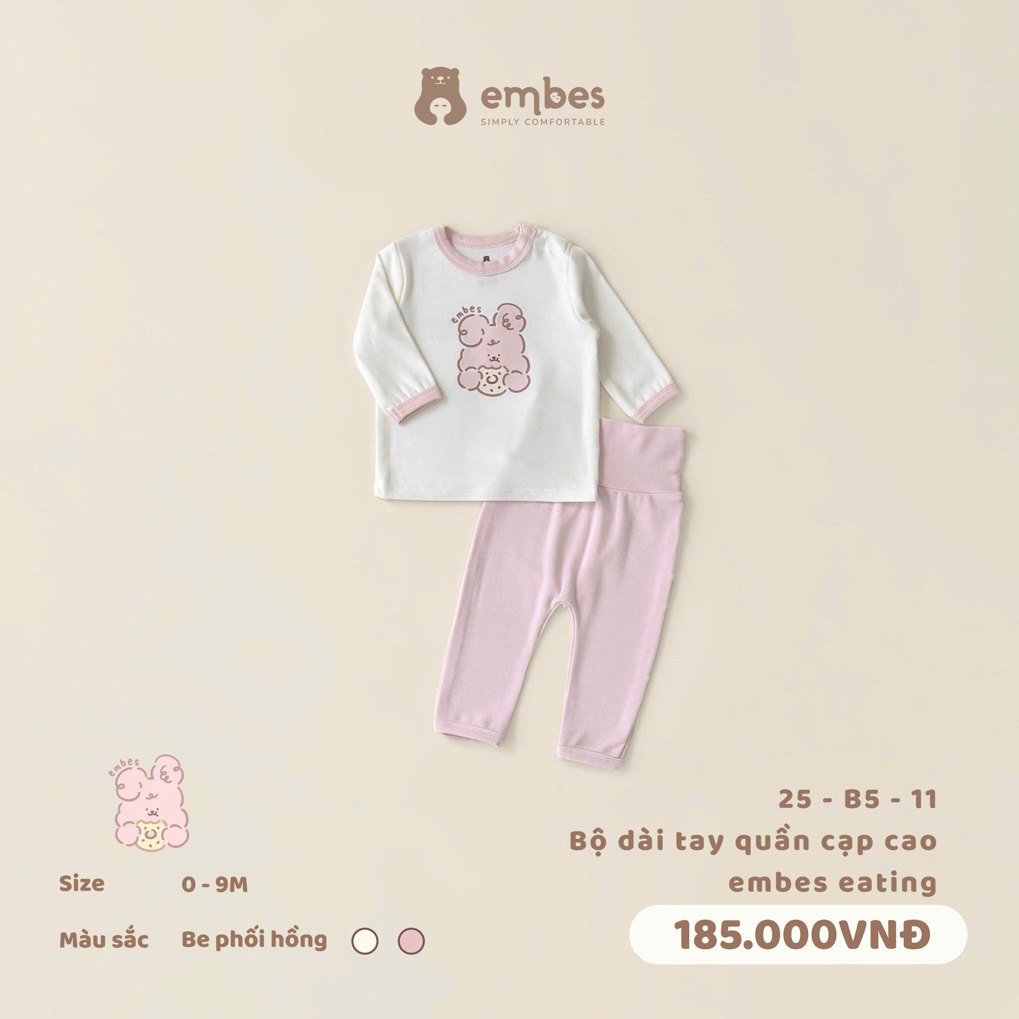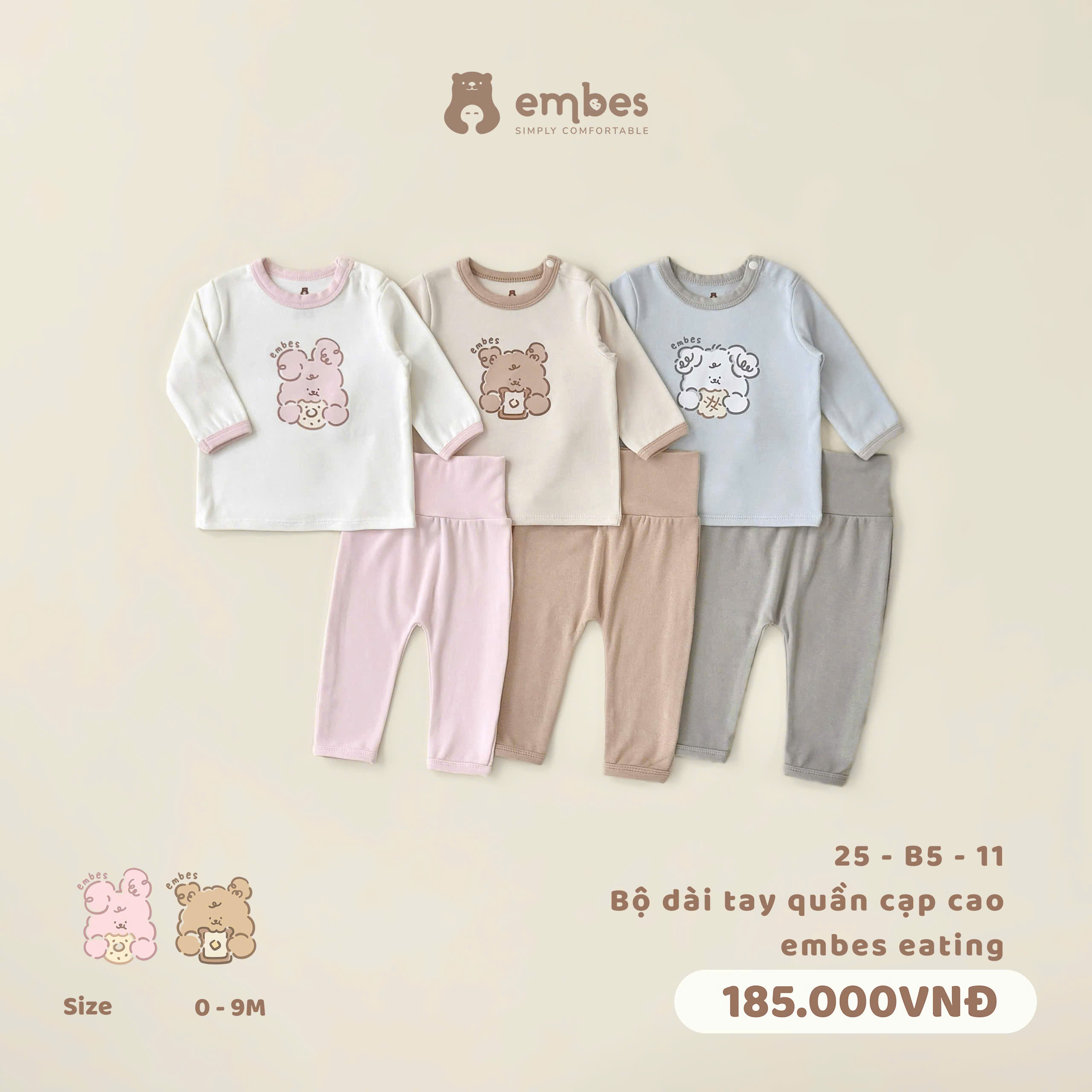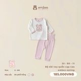- Thiết kế: bộ dài tay quần cạp cao embes eating, hình in bé thỏ, gấu và cún trước mặt áo, hình in chữ ống quần