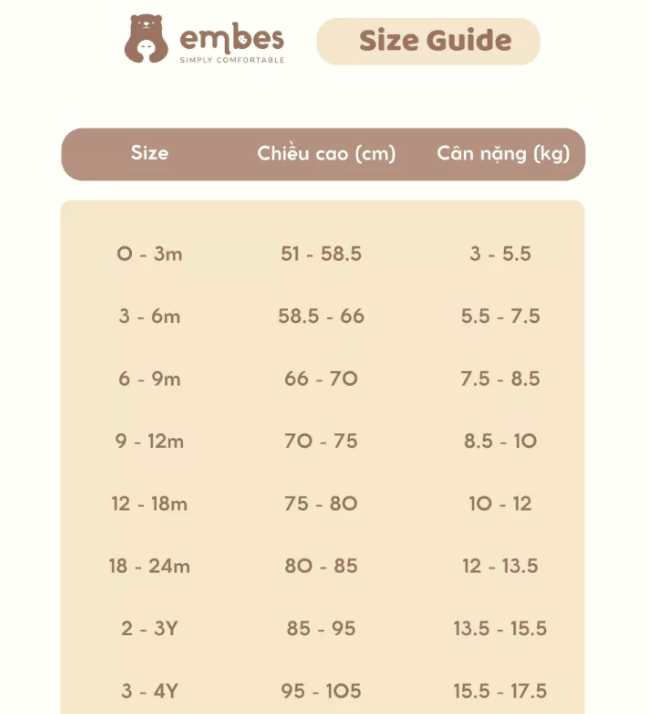 - Chất liệu, công dụng: Vải Embes Comfy vừa mềm mại, vừa có khả năng giữ ấm cơ thể bé trong tiết trời se lạnh, thích hợp để mặc cả ngày dài.