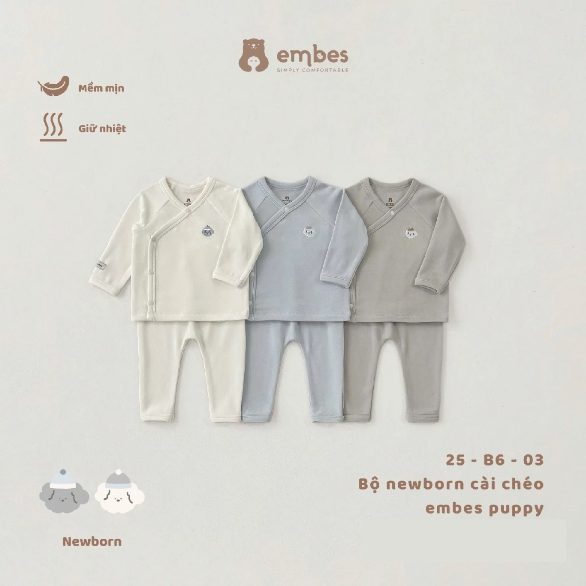 - Thiết kế: Bộ newborn cài chéo Embes puppy