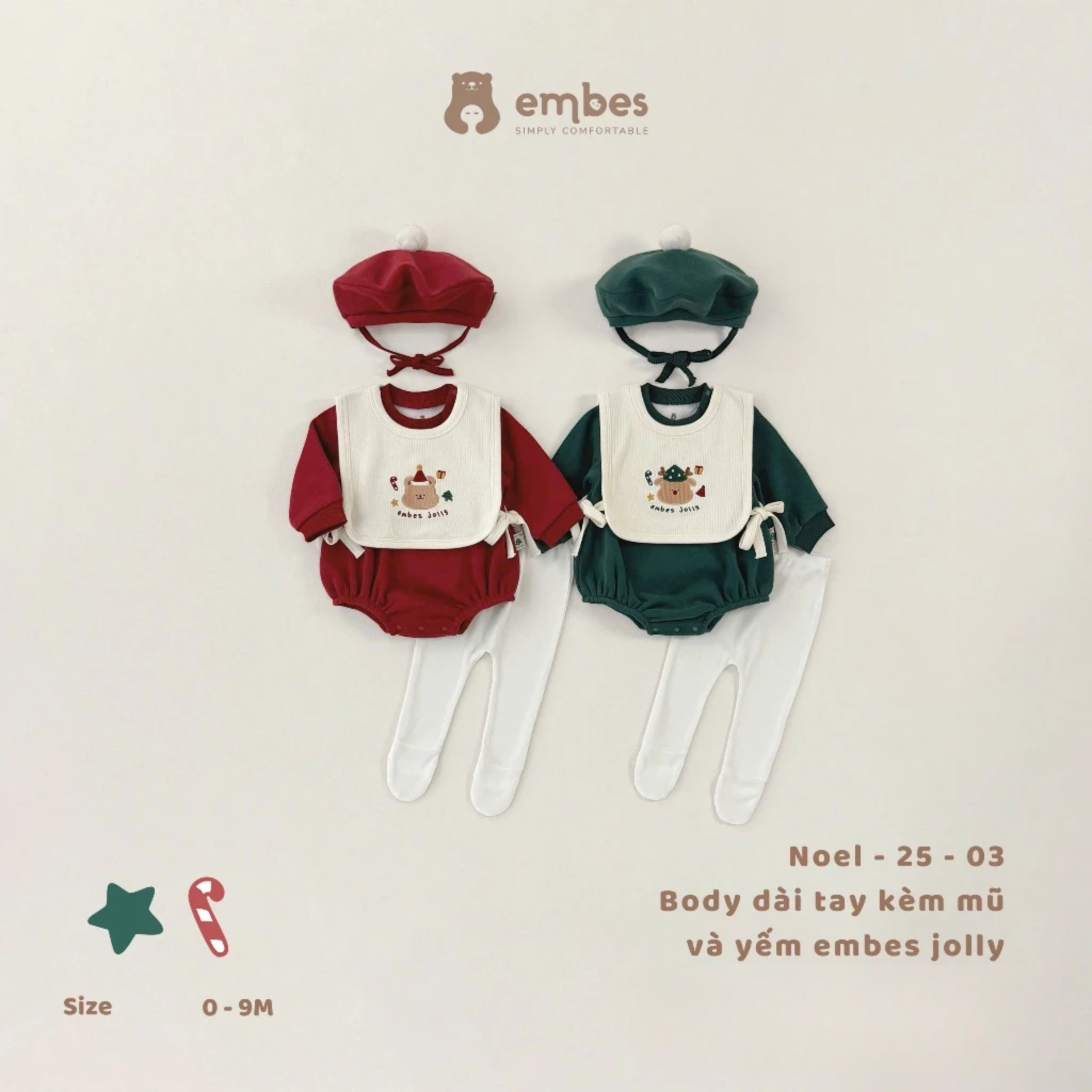 - Thiết kế: Body dài tay kèm mũ và yếm Embes Jolly