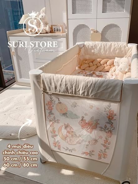 - Mở rộng liền kề giường mẹ với 4 mức điều chỉnh chiều cao (Cao 80cm, 60cm, 55-50cm) giúp Cho con bú ban đêm dễ dàng hơn, không khoảng cách