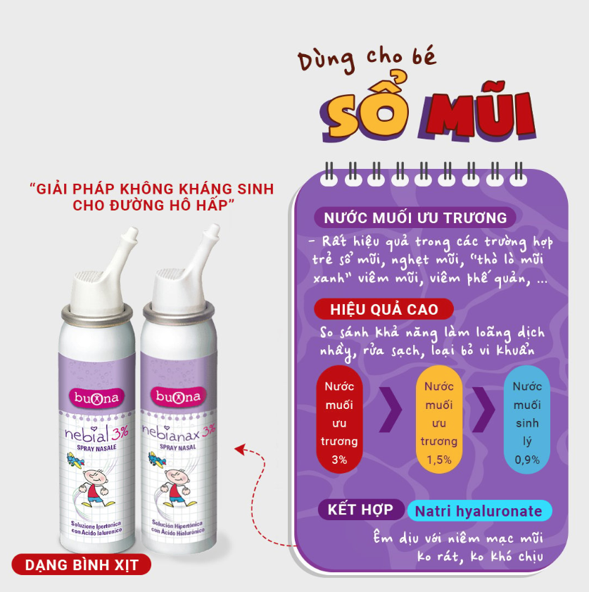 Buona dung dịch xịt mũi Nebial 3% đạt hiệu quả giữ ẩm và làm sạch mũi hàng ngày, đặc biệt trong các trường hợp cảm lạnh, viêm mũi, viêm xoang, viêm phổi, viêm phế quản... và trong mọi trường hợp tắc nghẽn niêm mạc mũi do nhầy nhớt.