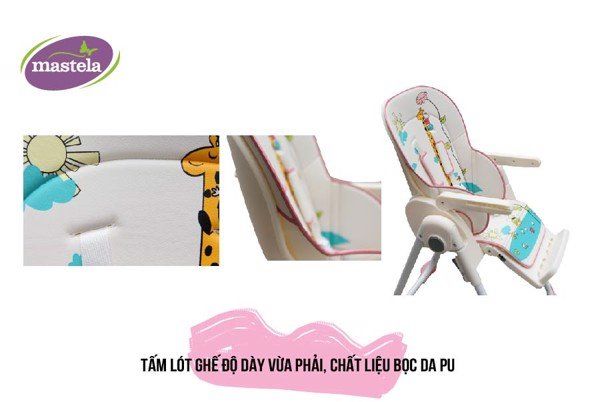- Ghế ngồi ăn cao Mastela 1015 được sản xuất từ chất liệu bọc da PU rất cao cấp và êm ái, mềm mịn lại có khả năng thoáng mát, dễ dàng vệ sinh khi dính bẩn ở phần ghế