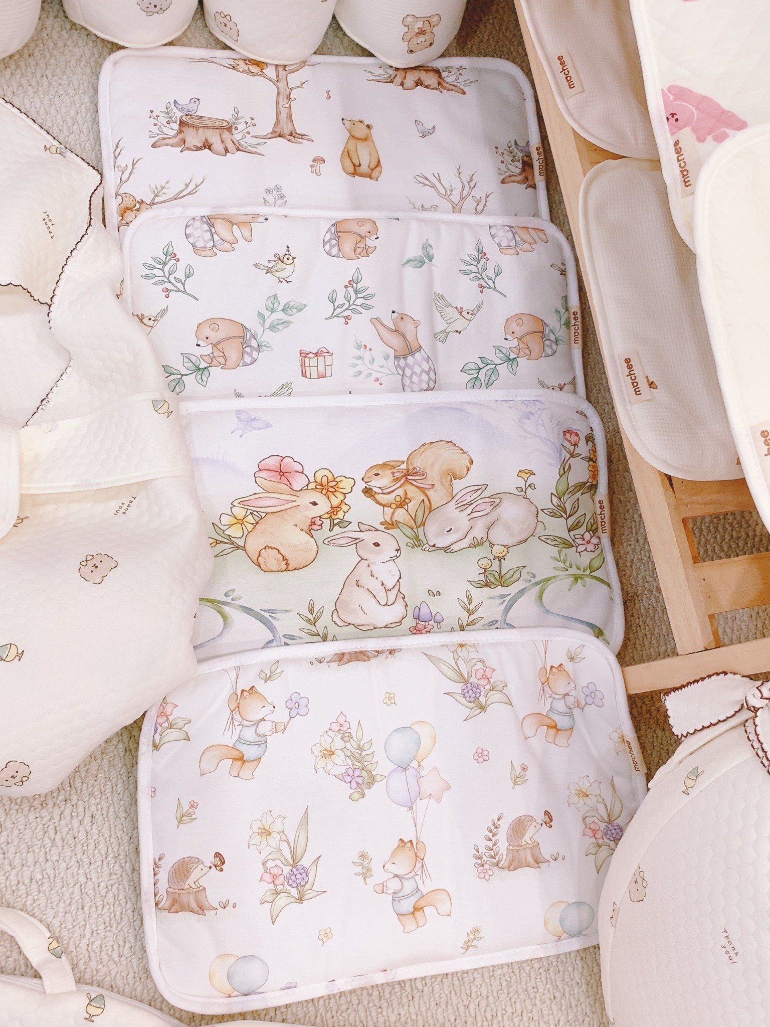 Họa tiết: Hình ảnh minh họa cho thấy họa tiết của dòng Velva Cotton mang phong cách ngộ nghĩnh, đáng yêu và nhẹ nhàng, với các nhân vật như thỏ, gấu, hươu đang đi dã ngoại. Màu sắc thường là tông trung tính, pastel (như màu be, hồng nhạt, xanh nhạt), phù hợp cho cả bé trai và bé gái, đồng thời tạo cảm giác thư thái, dễ chịu.