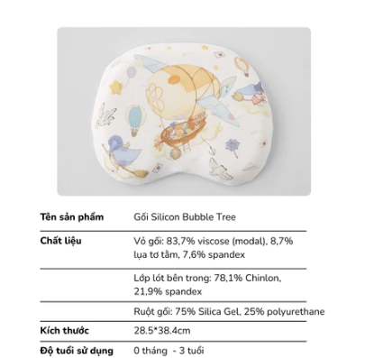 | Cấu trúc lõi | Silica Gel + Polyurethane | Đây là sự kết hợp vật liệu tạo nên lõi gối đàn hồi cao, giúp định hình đầu bé một cách nhẹ nhàng mà không bị xẹp lún. | |