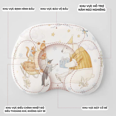 | Lỗ thông khí | Thoát mồ hôi, thoáng khí | Cấu trúc lõi gối và vỏ gối được thiết kế để lưu thông không khí tối ưu, giúp vùng đầu bé luôn khô ráo, tránh hầm bí và rôm sảy. |