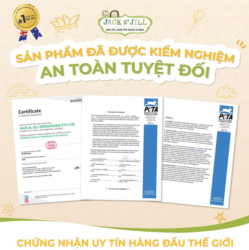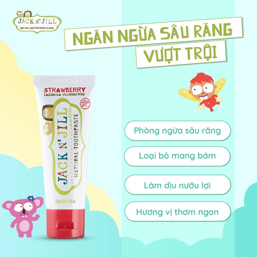 - Jack N’ Jill Natural Toothpaste có chiết xuất từ hoa cúc kim tiền, thông qua quá trình sản xuất đúng tiêu chuẩn, được chứng nhận bởi USDA Hoa Kỳ, giúp chăm sóc nướu, chống viêm lợi.