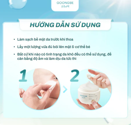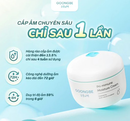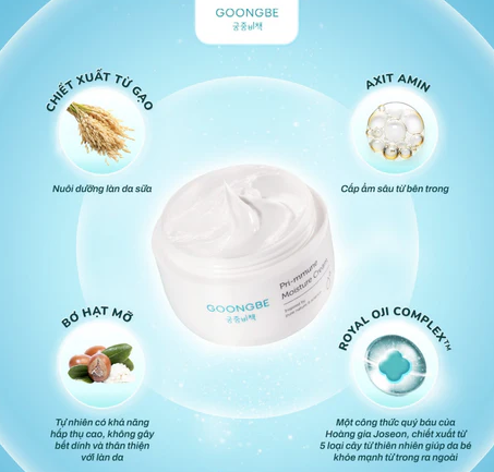 - Kem dưỡng ẩm sâu Goongbe Pri-mmune Moisture sử dụng thành phần đặc biệt phức hợp Royal Oji - Một công thức quý bái của Hoàng gia Joseon, chiết xuất 5 loại cây từ thiên nhiên giúp da bé hấp thụ hoạt chất tối đa, da khỏe mạnh từ trong ra ngoài
