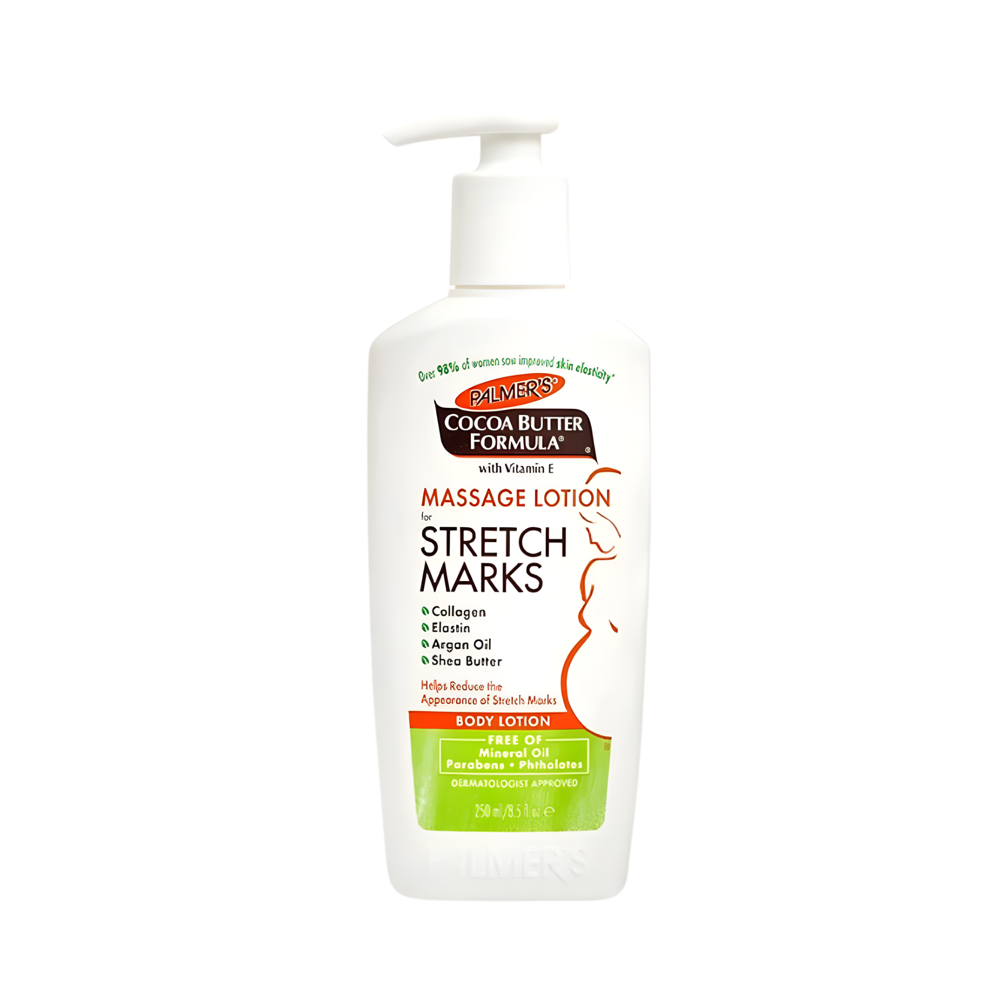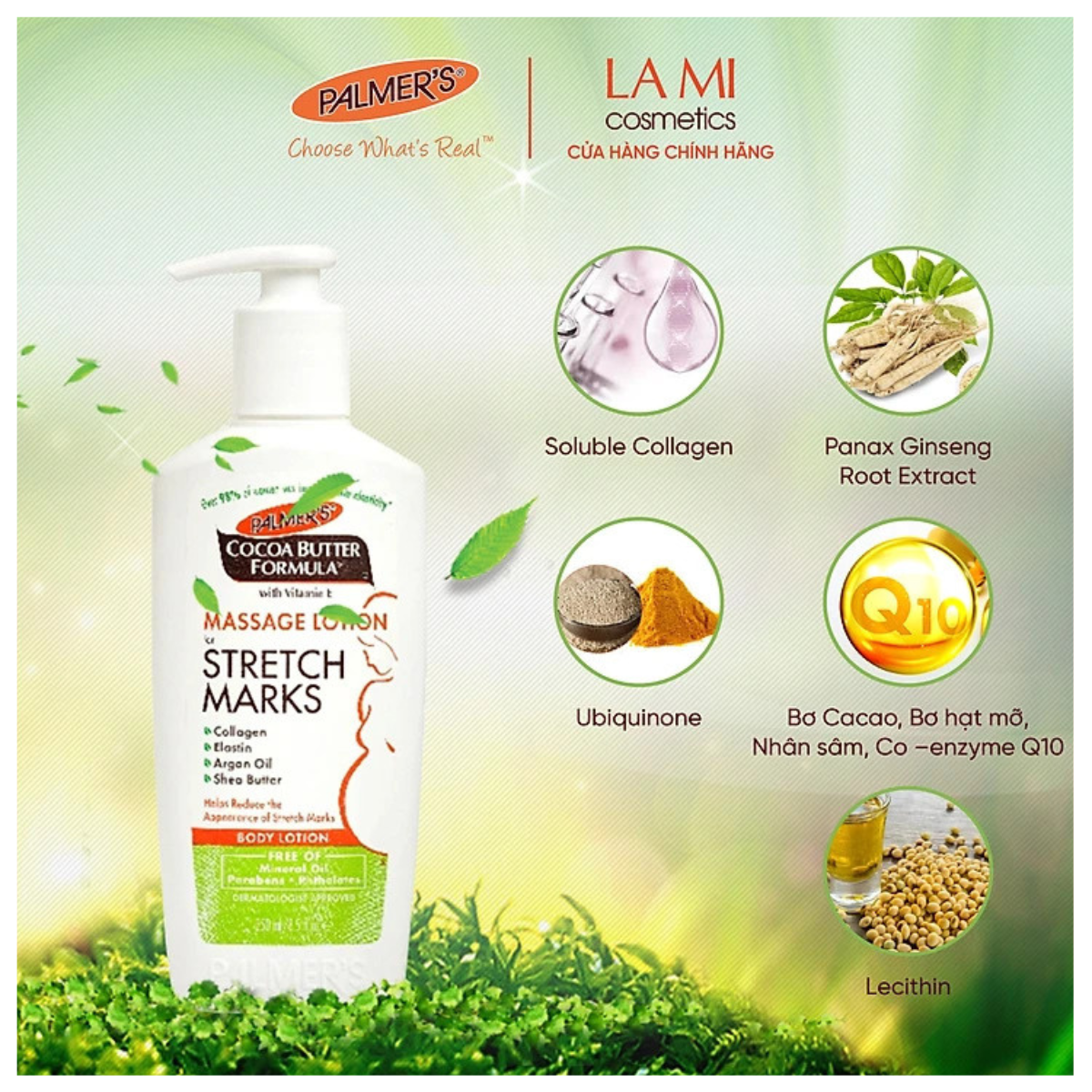 - Lotion dưỡng ẩm 250ml - ngừa rạn da đầu thai kỳ Palmer's có chiết xuất 100% từ tinh chất bơ Cacao tự nhiên, bổ sung Collagen, Bio-Elastin đặc biệt, Vitamin E là sản phẩm xua tan nỗi lo lắng của phụ nữ về làn da bị rạn do mang thai và sau khi sinh.