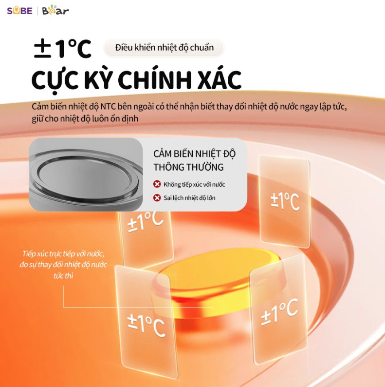 Cảm biến nhiệt NTC nhận biết thay đổi nhiệt độ nước ngay lập tức. Với máy đun nước hâm sữa cần nhiệt độ chính xác đến từng độ C, bộ phận cảm biến hiện đại hỗ trợ mẹ trong việc căn chỉnh nhiệt độ tự động. Sữa được hâm nóng ở nhiệt độ lý tưởng, giữ nguyên dưỡng chất và an toàn cho bé.
