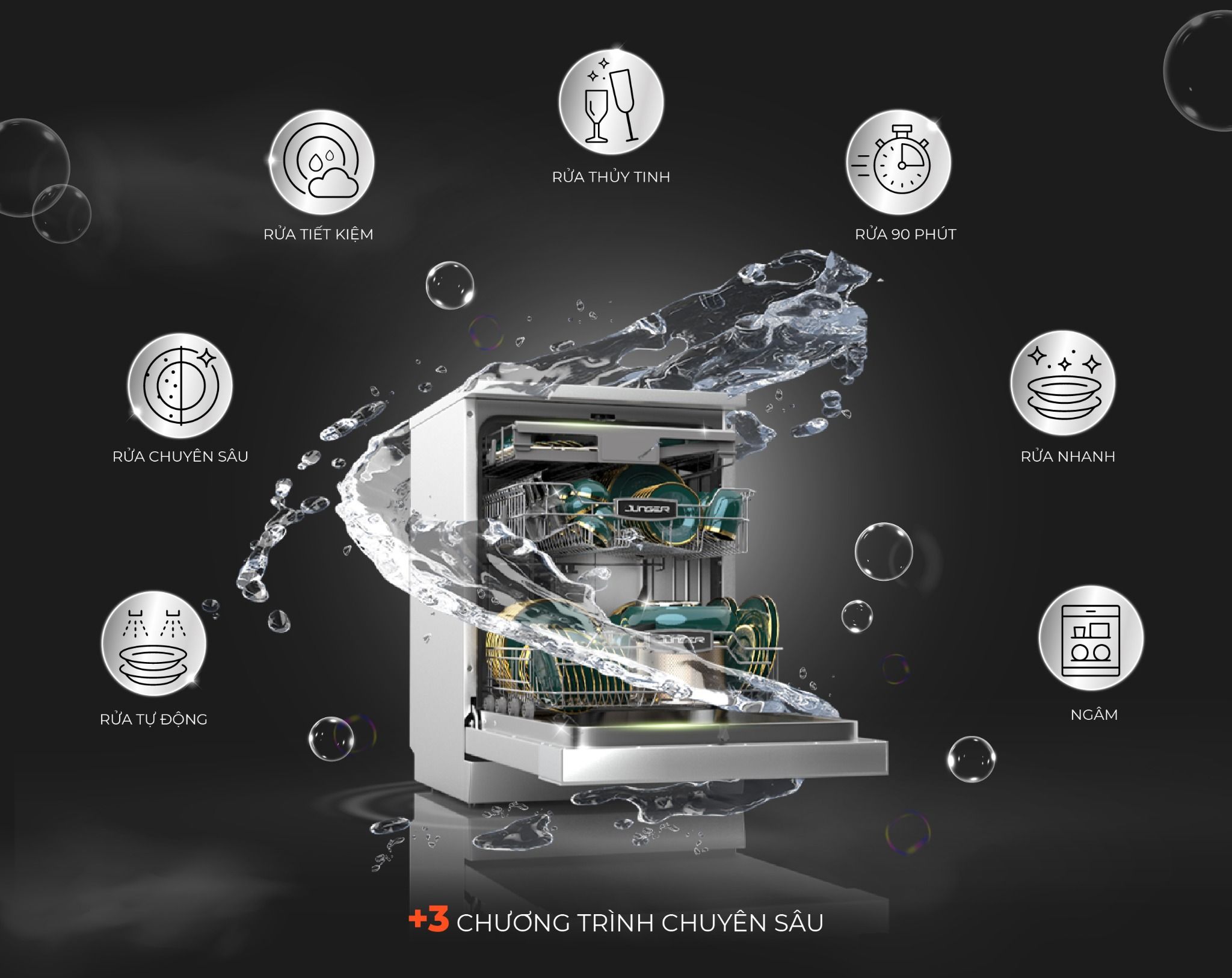 Máy rửa bát Junger DWJ-600 nổi bật với công nghệ rửa khử khuẩn bằng nước nóng 70℃ đánh bay vi khuẩn, nấm mốc, kết hợp sấy nóng bằng nhiệt tồn dư và gió đối lưu tuần hoàn giúp chén bát khô ráo hoàn toàn, không bám dính nước.