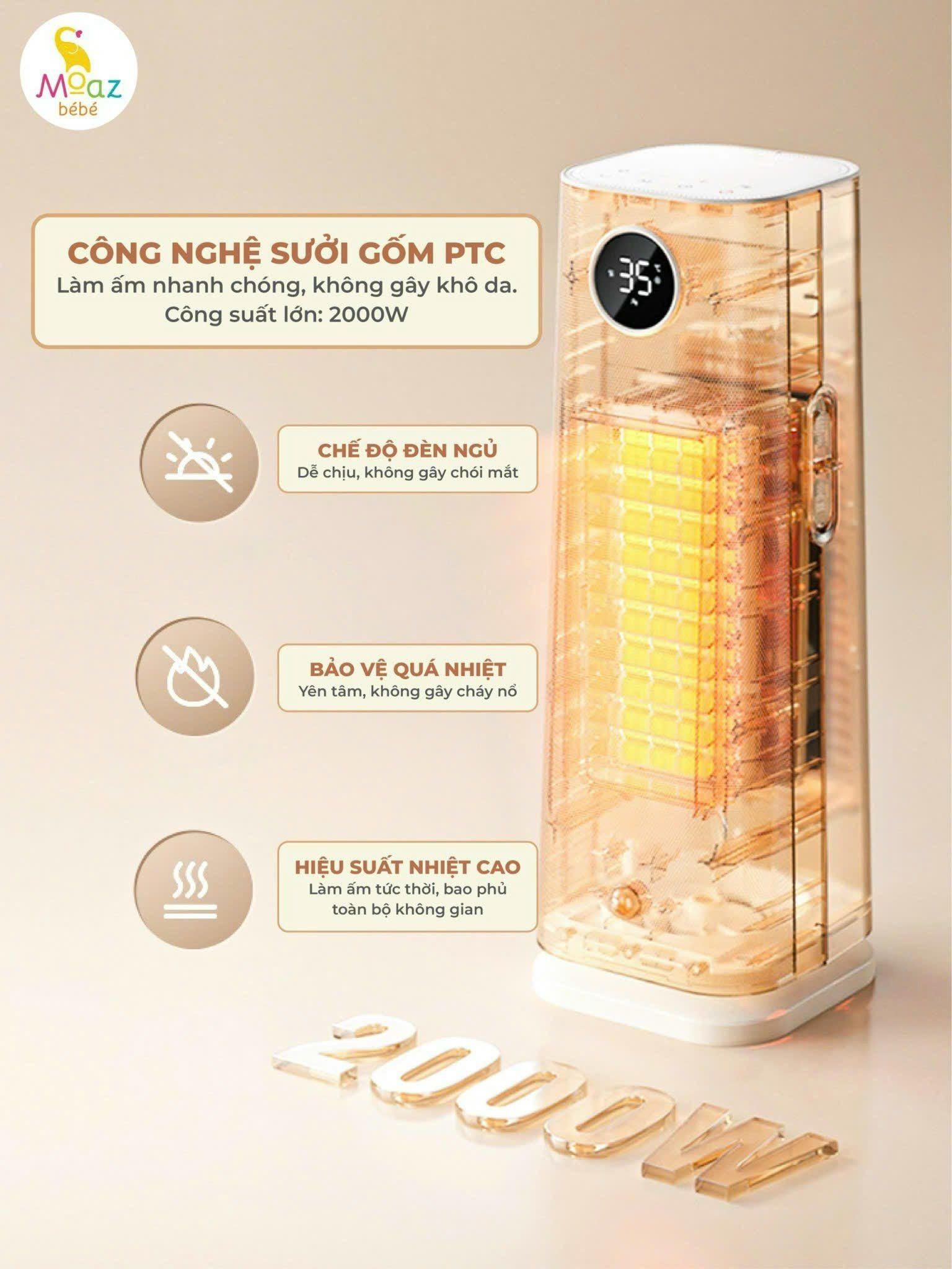 Vì vậy, Moaz Bé Bé đã cho ra mắt dòng máy sưởi điện công nghệ PTC với không khí ấm áp, cùng hệ thống tản nhiệt ấm đều không gian. Sản phẩm sử dụng không đốt oxy không gây ngột ngạt khó thở ngay cả khi ở trong phòng kín. Không gây nóng rát, khô da có thể đặt ngay trong phòng ngủ. Thiết kế tích hợp nhiều tính năng hiện đại giúp gia đình thuận tiện sử dụng và có một mùa đông ấm áp.