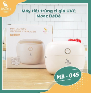 - Máy tiệt trùng ti giả UVC Moaz BéBé MB – 045 là dòng máy tiệt trùng của Moaz BéBé giúp tiệt trùng sạch vi khuẩn hạn chế nấm mốc trên núm ti giả, núm bình sữa, gặm nướu cho bé một cách đơn giản và tiết kiệm thời gian.