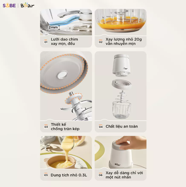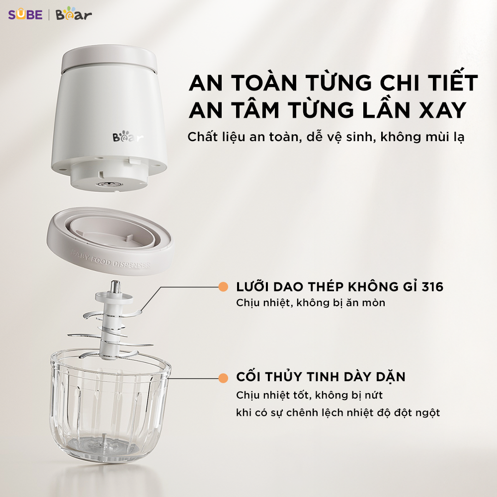 Một trong những nỗi lo lớn nhất của các mẹ là bé bị hóc hoặc khó tiêu do thức ăn còn lợn cợn, không nhuyễn mịn. Máy xay ăn dặm Bear 0.3L CH-5H02D24 sẽ giúp mẹ giải quyết vấn đề này: