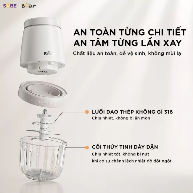 Máy xay ăn dặm Bear 0.3L CH-5H02D24 được làm từ chất liệu cao cấp, được chứng nhận an toàn khi sử dụng để chế biến đồ ăn dặm cho bé.
