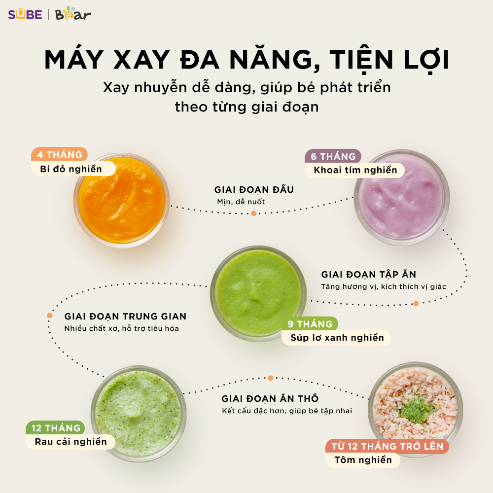 Giai đoạn 11 tháng trở lên: Nhấn nhanh 1-2 lần để xay dạng thô, miếng nhỏ giúp bé tập nhai.
