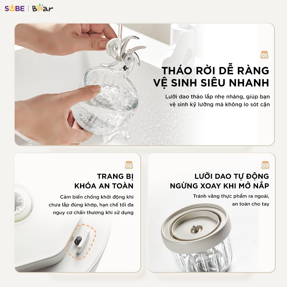 Không còn nỗi “ám ảnh” lúc vệ sinh máy sau khi sử dụng, máy xay ăn dặm Bear với các chi tiết tinh tế, dễ dàng tháo lắp nhằm tối ưu quá trình sử dụng cho mẹ.