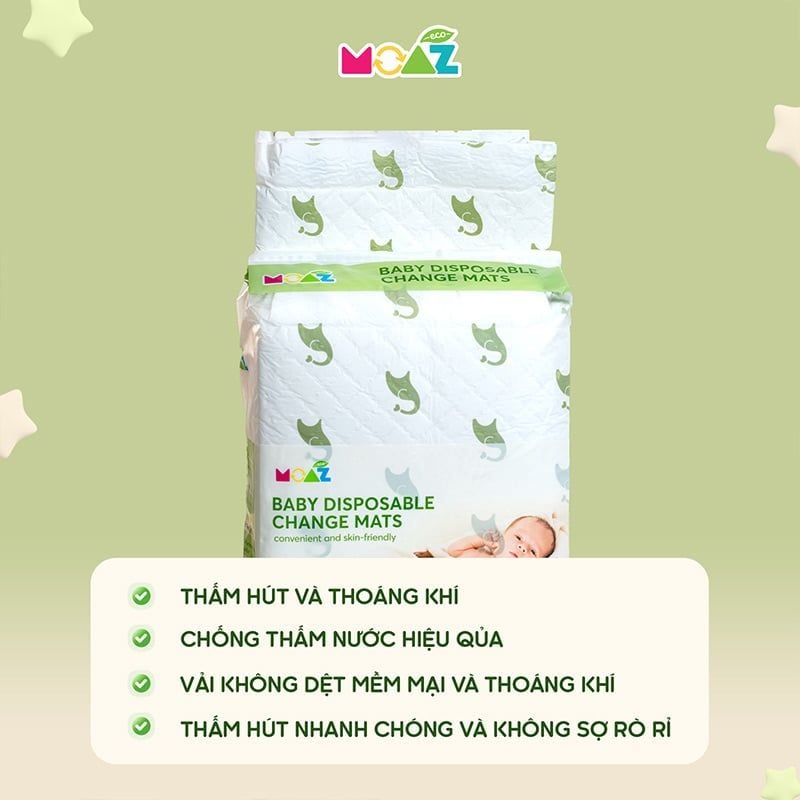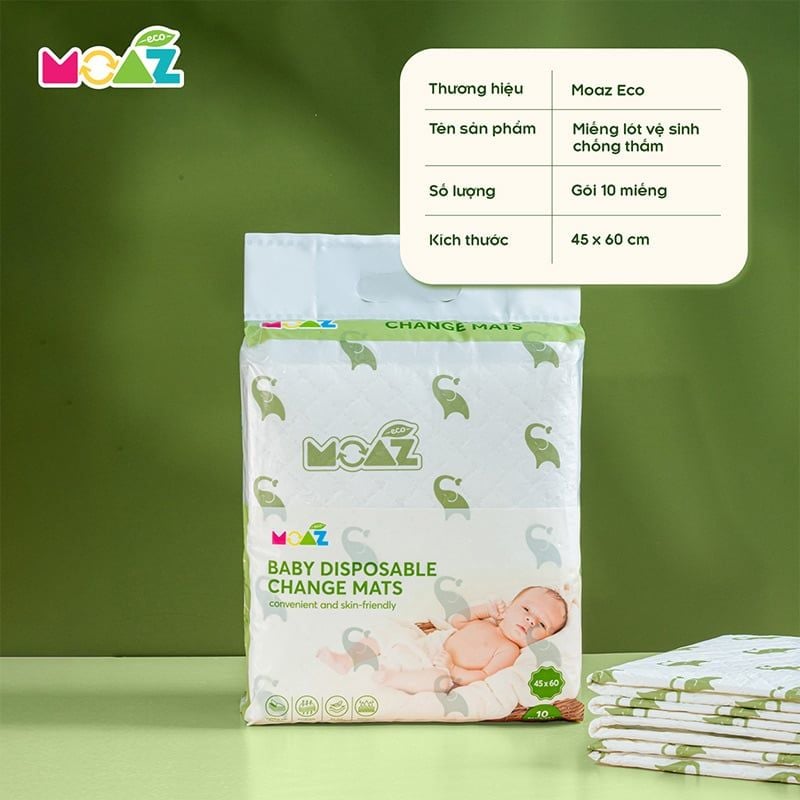 Miếng lót vệ sinh chống thấm (lót thay bỉm) Moaz Eco 10 miếng kích thước 45x60cm vừa vặn để lót quanh bé khi thay bỉm. Sản phẩm được làm từ chất liệu cao cấp, có khả năng thấm hút mạnh, sản xuất bằng công nghệ hiện đại, kháng khuẩn, thoáng khí. Miếng lót mang đến giải pháp tối ưu cho ba mẹ khi vệ sinh cho bé, giúp gia đình chăm sóc sức khỏe của bé an toàn, hiệu quả và đỡ vất vả hơn.