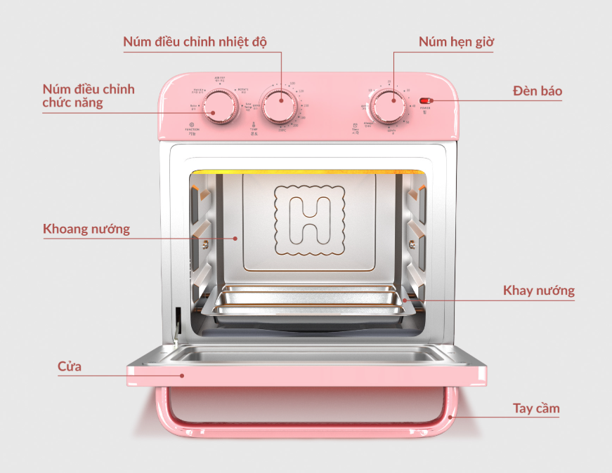 - Đèn sáng khi mở cửa và trong suốt quá trình nướng và khi mở cửa.
