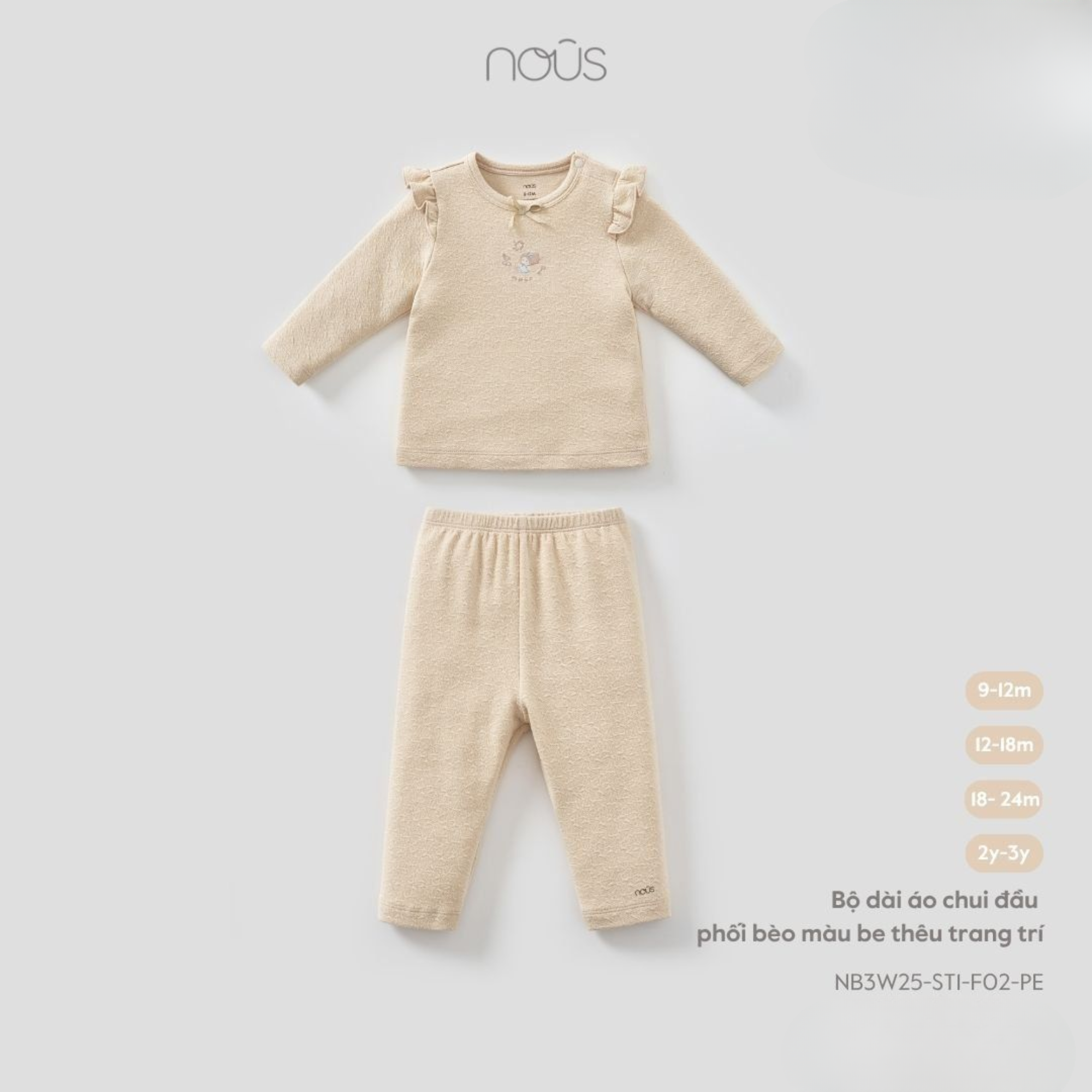 "Nous Bộ dài áo chui đầu phối bèo be thêu trang trí Velours" là một sản phẩm thời trang trẻ em cao cấp của thương hiệu Nous Việt Nam.