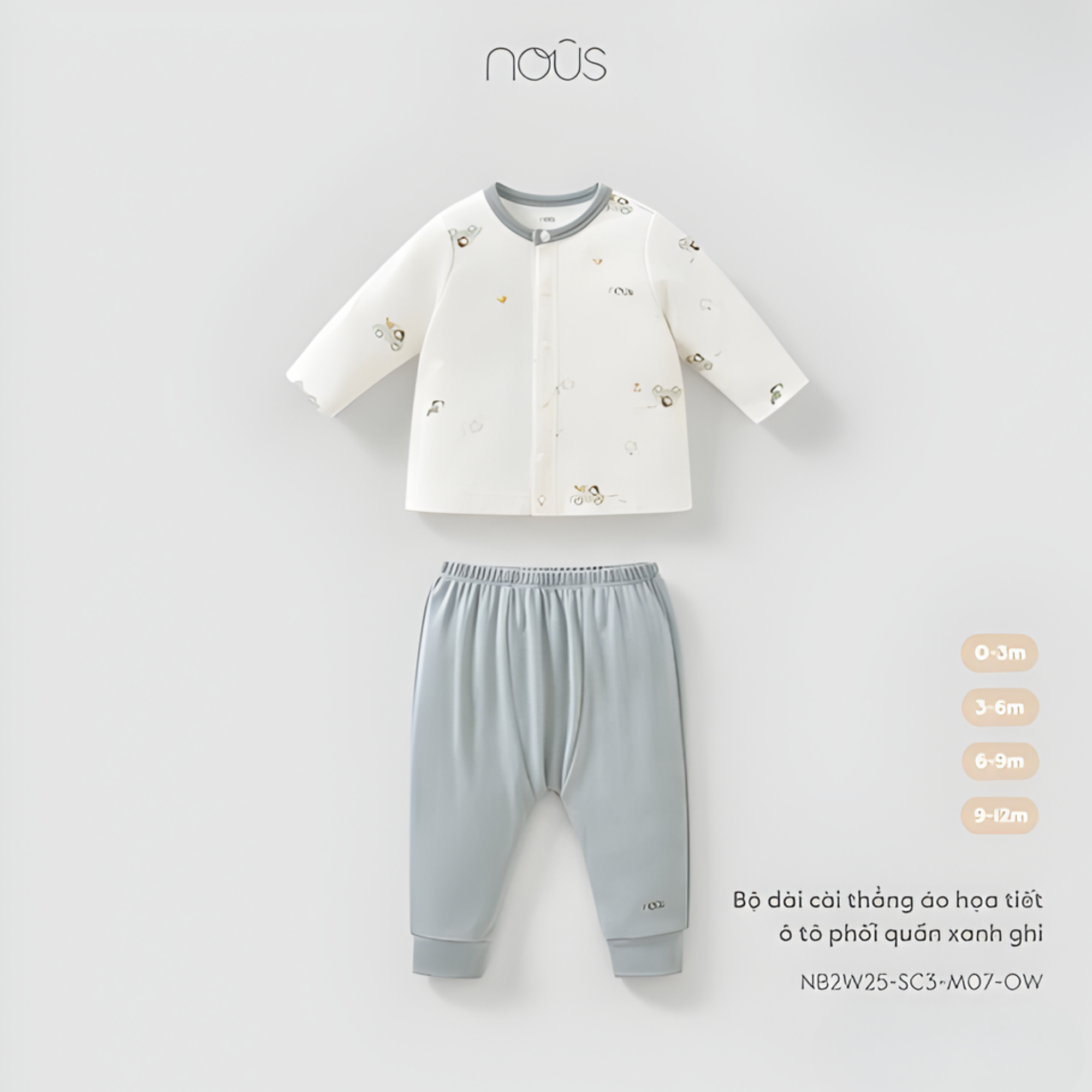 Bộ sản phẩm Nous Bộ dài cài thẳng áo họa tiết ô tô phối quần xanh ghi Velours là trang phục cho trẻ em với áo sơ sinh cài thẳng in họa tiết ô tô và quần dài màu xanh ghi, được làm từ chất liệu vải velour mềm mại, ấm áp.