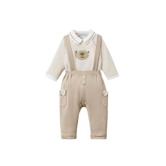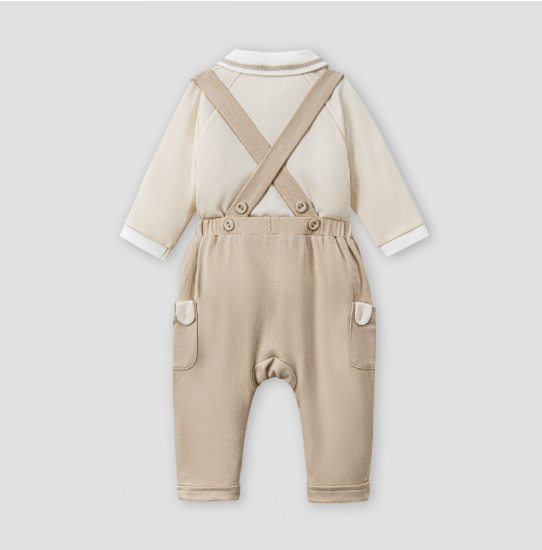 Tên sản phẩm: Bộ dài tay áo cài lệch be phối quần yếm nâu.