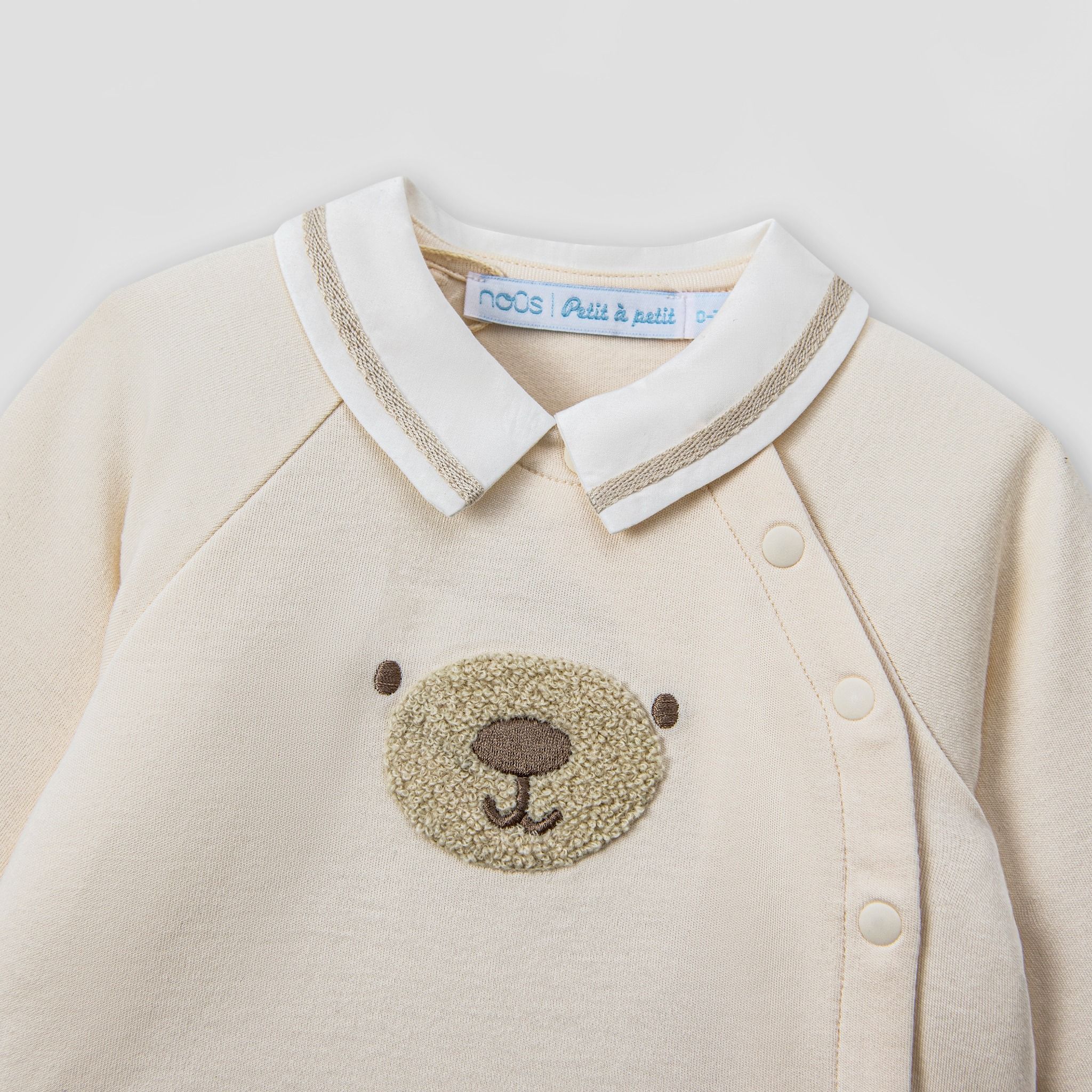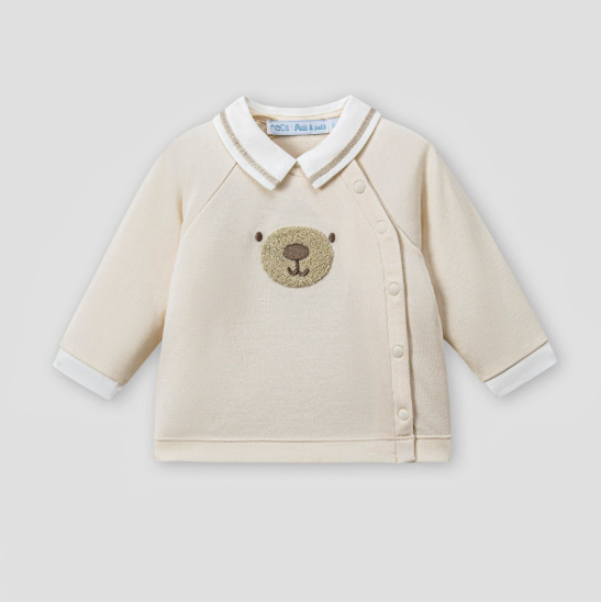 Thân áo: Có chi tiết thêu hình mặt gấu nâu ở ngực, là điểm nhấn chính của bộ trang phục.