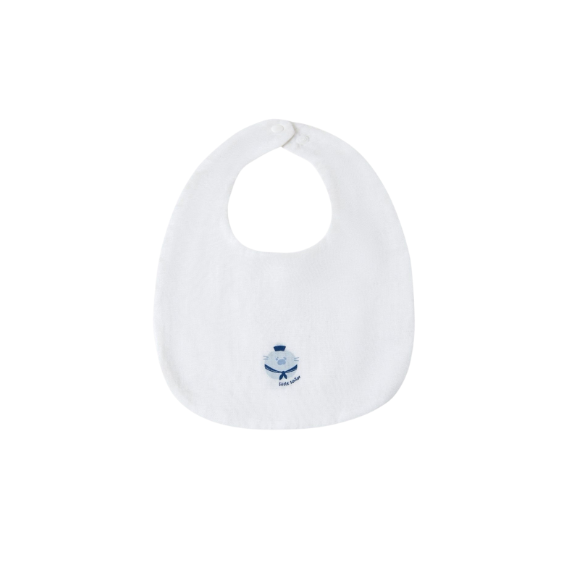 Họa tiết: Nền yếm màu trắng trơn, có một chi tiết thêu/in họa tiết nhỏ ở giữa yếm (trong hình là hình ảnh gấu hoặc biểu tượng nhỏ màu xanh), tạo điểm nhấn đáng yêu.