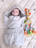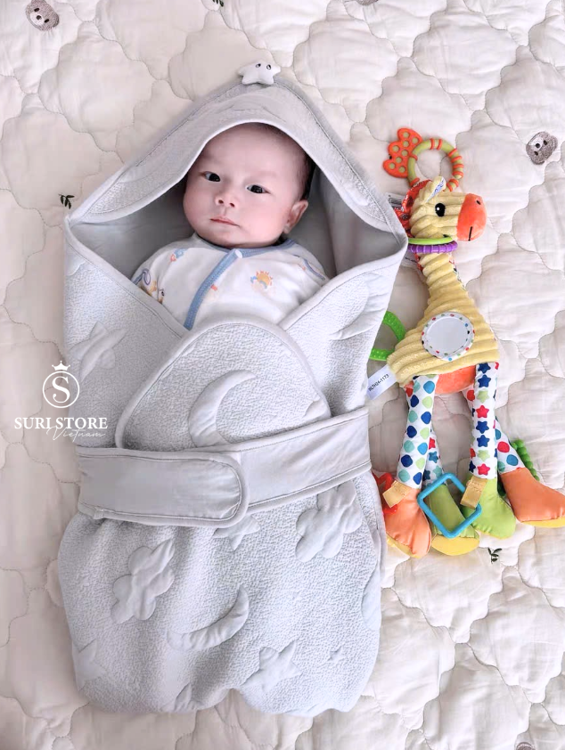 - Quấn ủ xám có mũ AQPA: Giúp bé có cảm giác an toàn như trong bụng mẹ, chống giật mình, nhờ đó bé ngủ ngon và sâu giấc hơn.