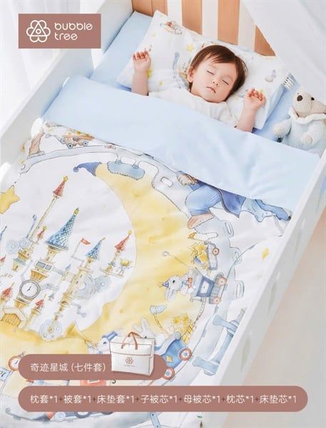 Thẩm mỹ: Họa tiết lâu đài, trăng sao, khinh khí cầu và các nhân vật động vật đáng yêu, mang lại vẻ ngoài tinh tế và sang trọng cho phòng ngủ bé.