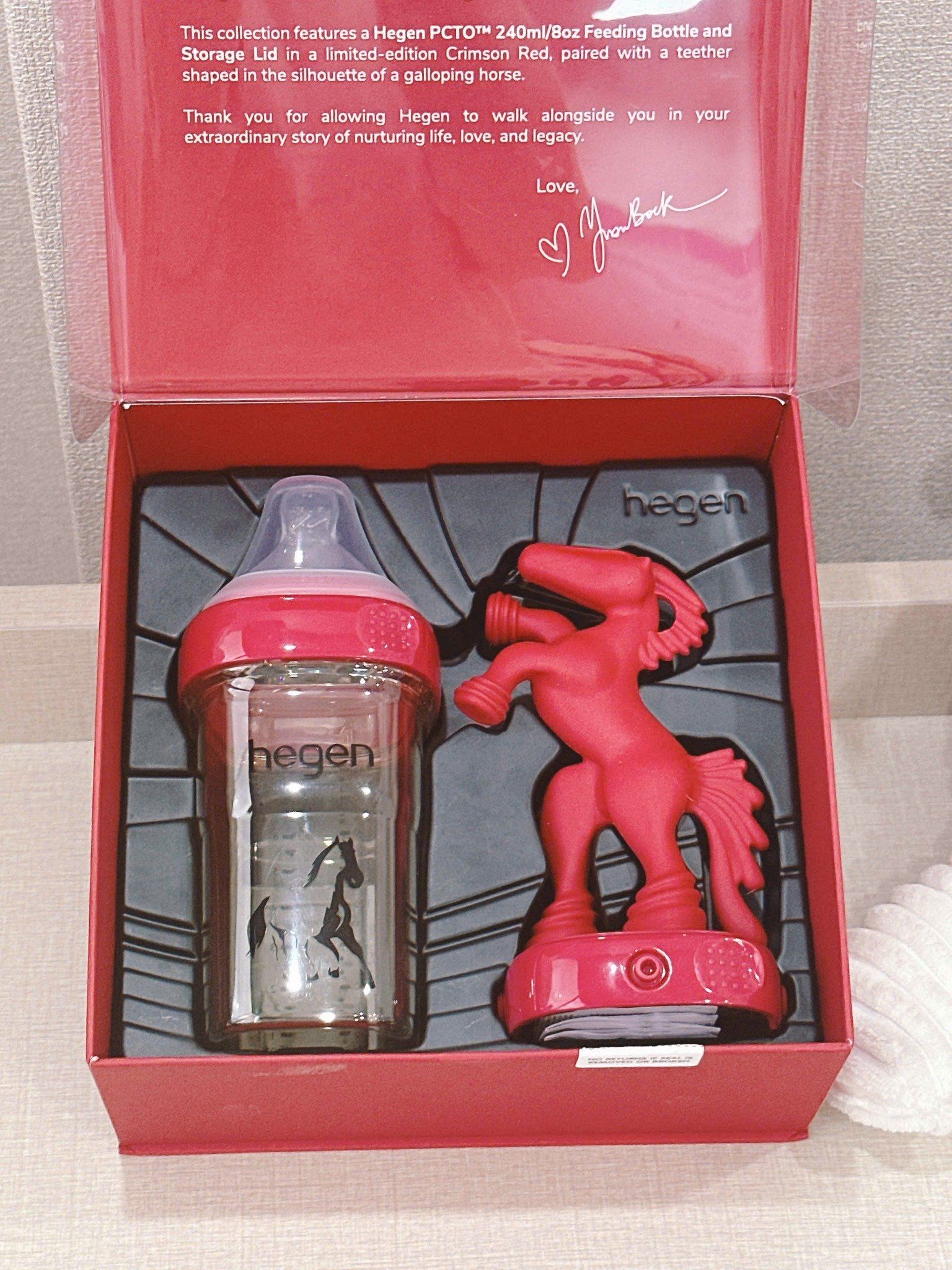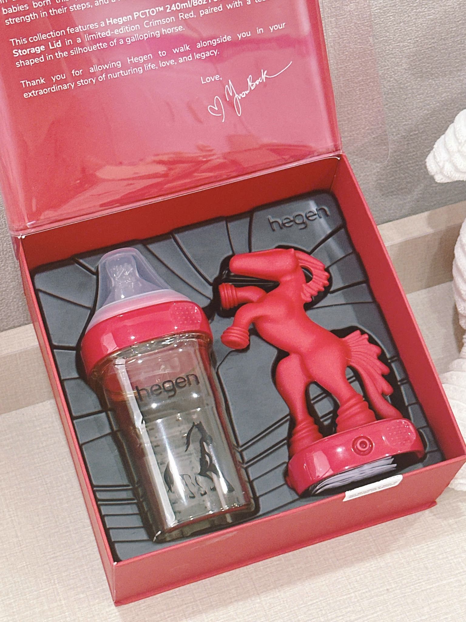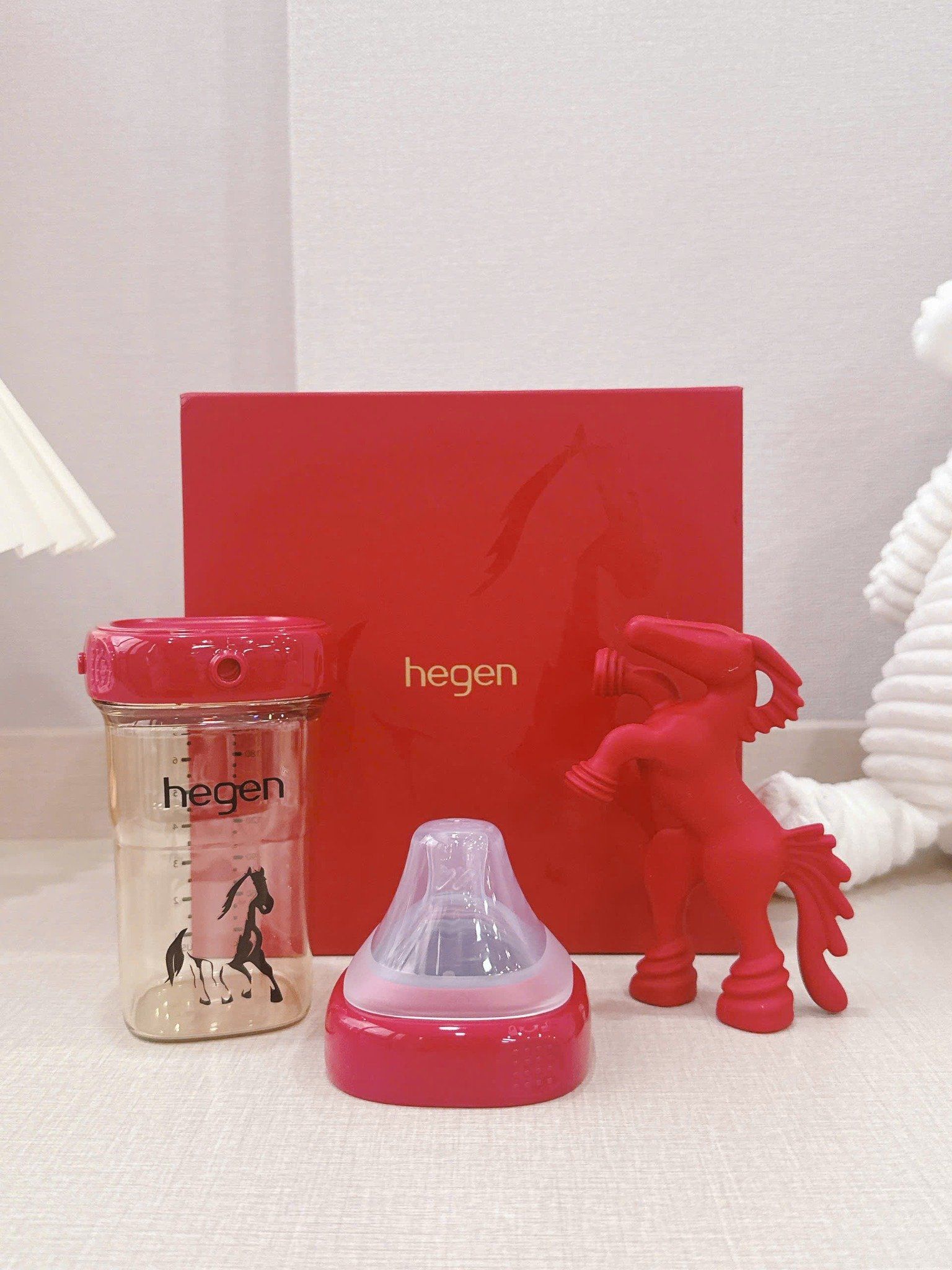 - Bình sữa Hegen PCT 240ml/8oz PPSU, kết hợp với Núm ngậm nướu Majestic Stallion được chế tác tỉ mỉ với hình dáng một chú ngựa phi nước đại, vừa là người bạn đồng hành êm dịu cho nướu răng ngứa ngáy của bé, vừa là bình sữa có thể chuyển đổi thành hộp đựng đồ với nắp đậy màu đỏ ma vương phù hợp khi bé lớn lên.