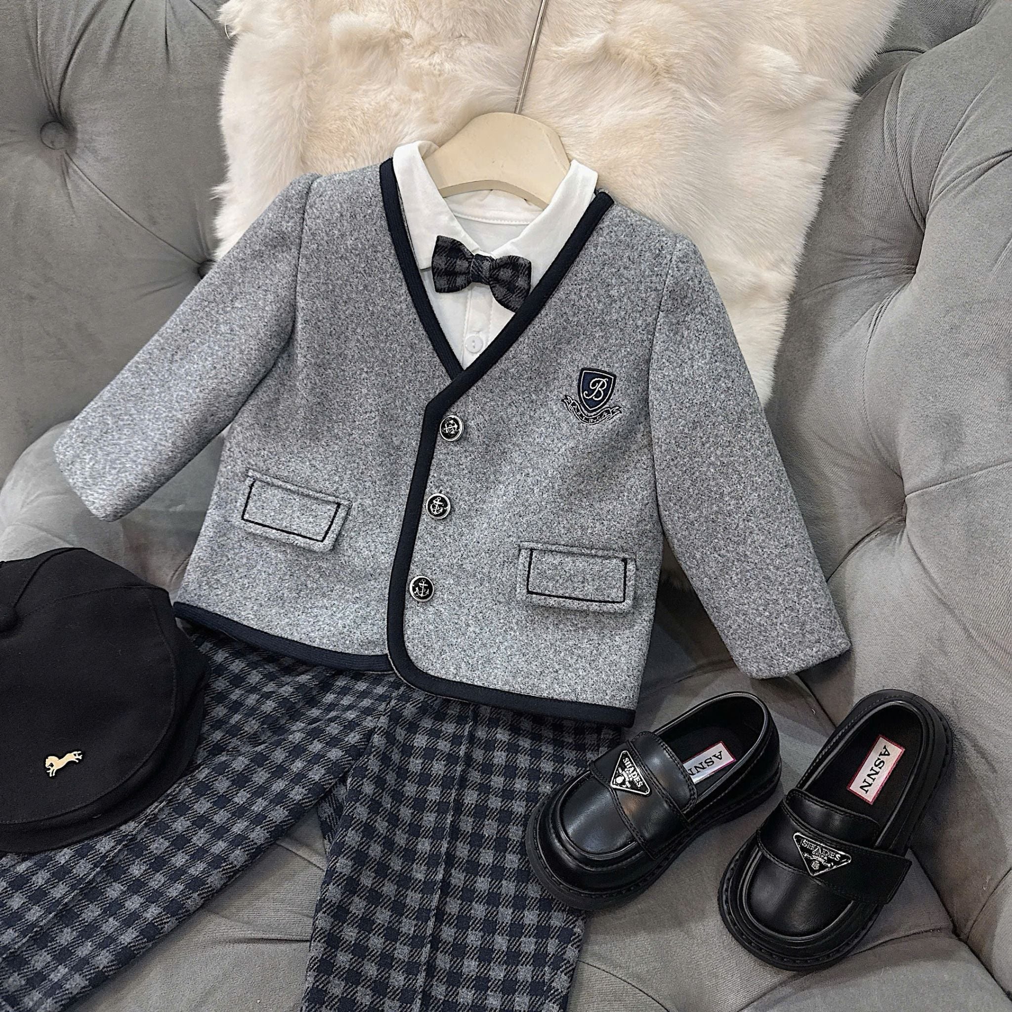 Set vest này là hiện thân của sự lịch lãm và thời trang cao cấp, lấy cảm hứng từ phong cách cổ điển của Anh Quốc và Châu Âu. Với họa tiết nổi bật và màu sắc trung tính, đây là trang phục hoàn hảo giúp bé yêu tỏa sáng trong mọi sự kiện dịp Tết.