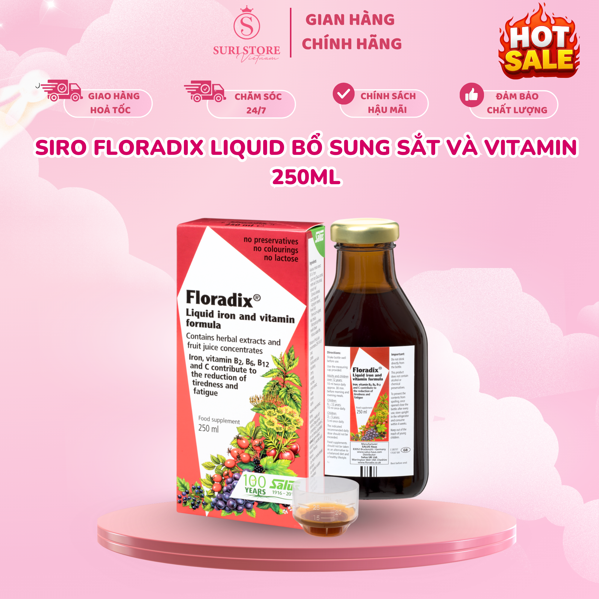 - Floradix Liquid Iron And Vitamin Formula 250ml là một lựa chọn đầu tiên của người phụ nữ cho sức khỏe, năng lượng và sức sống. Floradix chứa một dạng sắt hữu cơ dễ dàng đồng hóa, chiết xuất các loại thảo mộc được lựa chọn cẩn thận, nước ép trái cây thơm ngon, và phức hợp vitamin C và B.