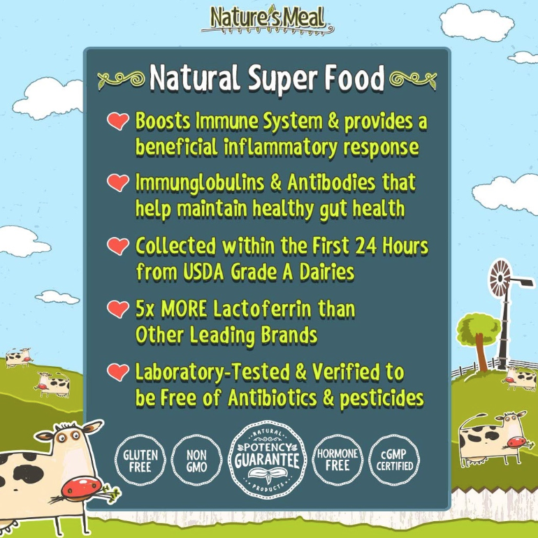 - Sữa non Nature's Meal được sản xuất từ sữa non của những chú bò hạng A và được chế biến trong vòng 24 giờ sau khi lấy, đảm bảo giữ được lượng kháng thể cũng như hương vị thơm ngon của sữa.