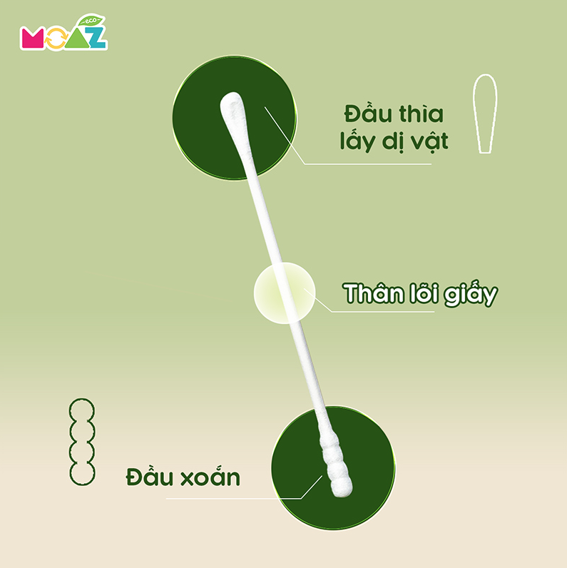 - Phần thân tăm bông sơ sinh Moaz Eco được làm từ lõi giấy, có độ mềm vừa phải, dễ dàng uốn cong, đồng thời vẫn đảm bảo độ cứng cần thiết, nhờ vậy giúp người dùng vệ sinh hiệu quả những vùng ngóc ngách vốn khó làm sạch.