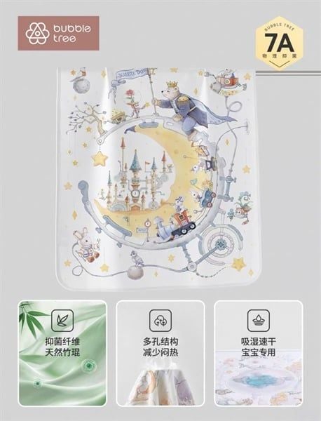 Chất liệu: Sản phẩm được làm từ vải cotton tre (Bamboo Cotton), một loại vải kết hợp giữa sợi tre và sợi bông, có đặc tính mềm mịn, thoáng khí, và an toàn cho làn da nhạy cảm của bé.