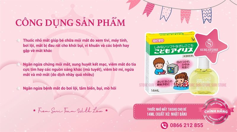 Thuốc nhỏ mắt không chỉ giúp rửa trôi bụi bẩn, mà còn giúp nhanh chóng phục hồi các vết xước khi trẻ ngứa mắt, giụi mắt nhiều gây đỏ mắt. Nhỏ mắt Taisho có thể dùng 5-6 lần trong ngày, giúp trẻ có đôi mắt sáng khỏe. Đặc biệt với trẻ đeo kính áp tròng, đây là một trong những sản phẩm không thể thiếu, giúp cho mắt điều tiết tốt hơn.