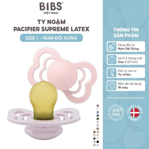 Đặc điểm ty ngậm núm đối xứng cao su tự nhiên BIBS Supreme Latex Size 1 từ 0-6 tháng tuổi: