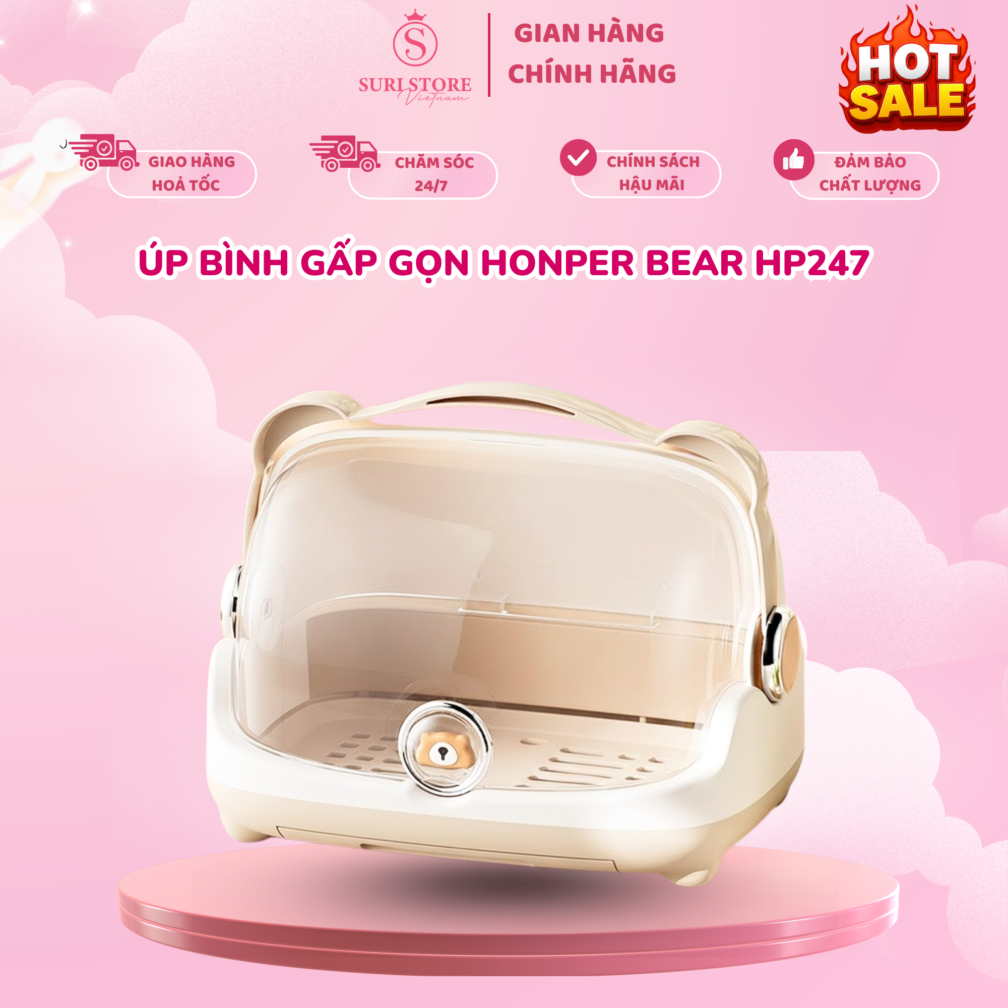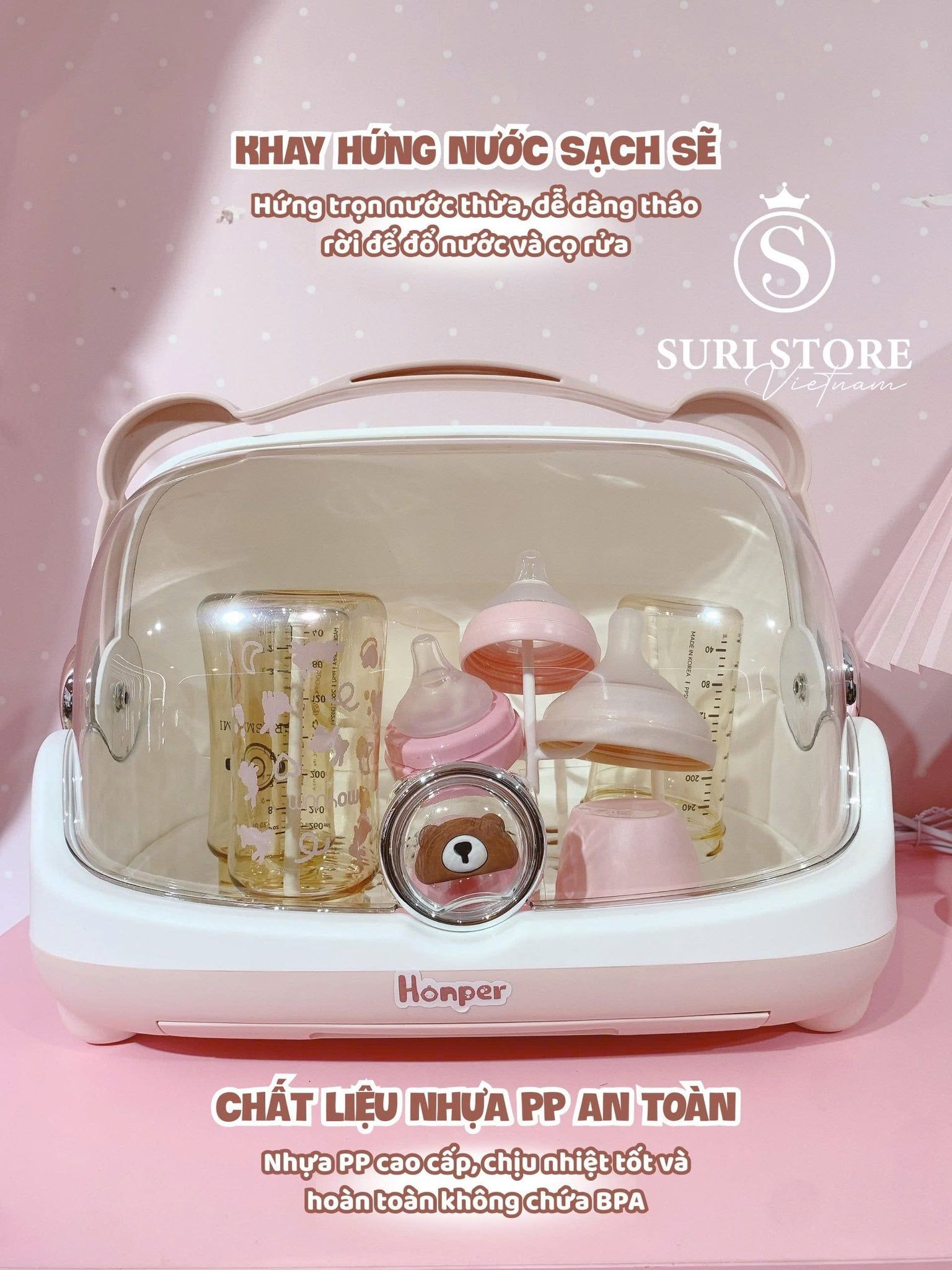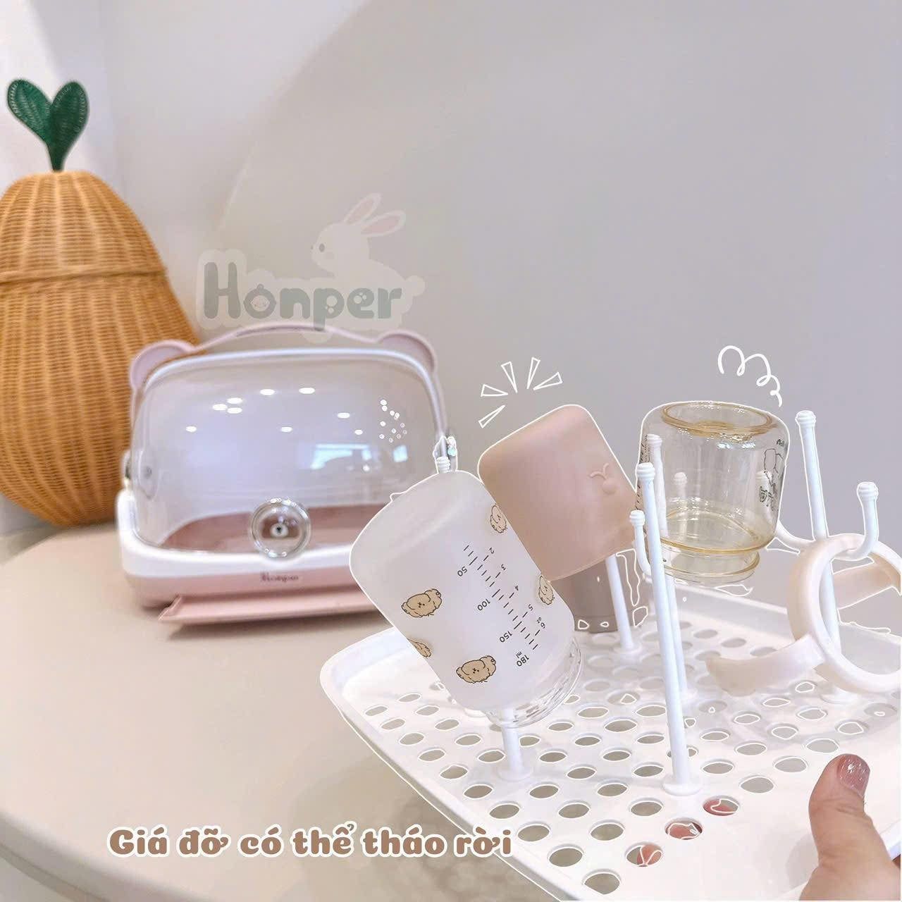 Góc pha sữa muốn gọn gàng thì phải có "trợ thủ " chuẩn chỉnh. Úp bình Honper bear chính là món đồ giúp mẹ tối ưu không gian một cách nhẹ nhàng nhất.