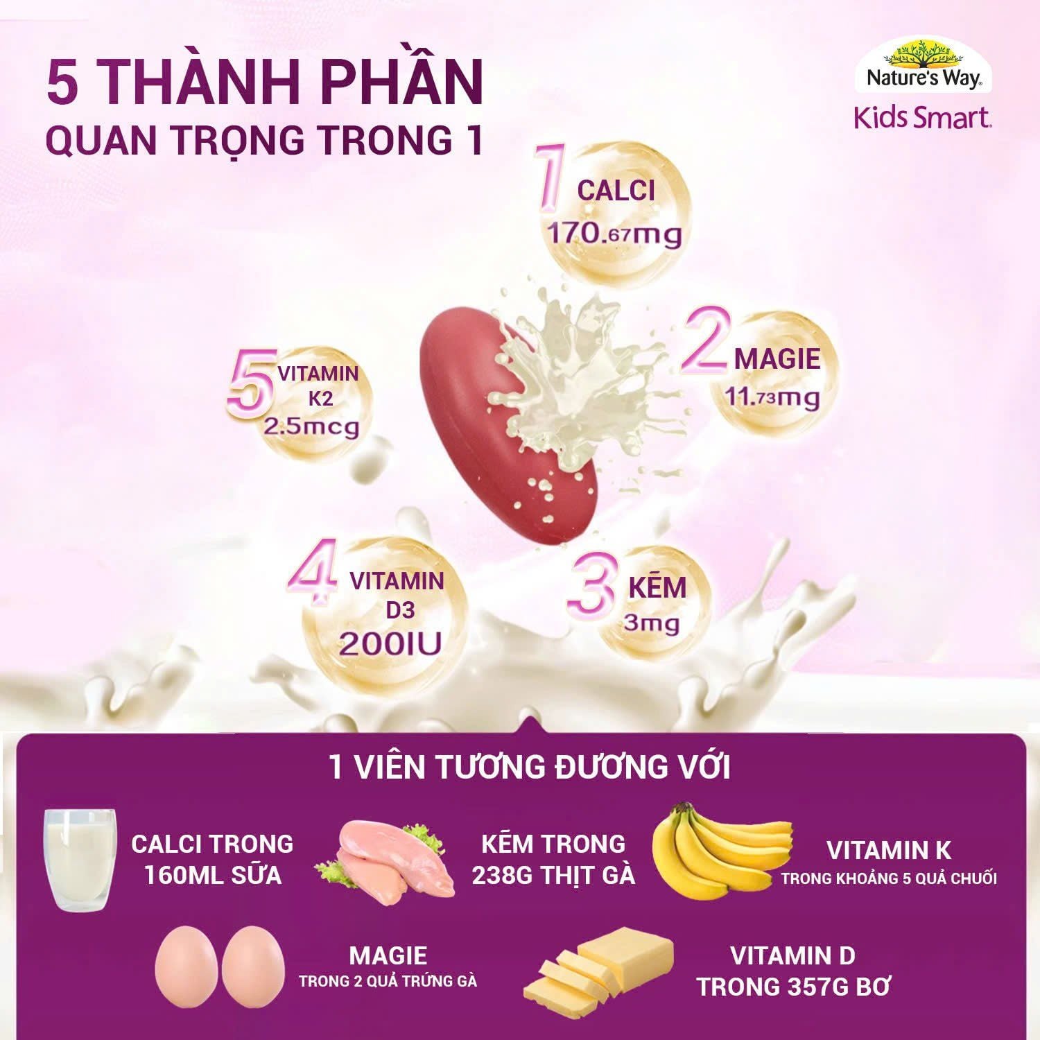 - Thành Phần Hoạt Tính: Calci, Vitamin D3, Vitamin K2