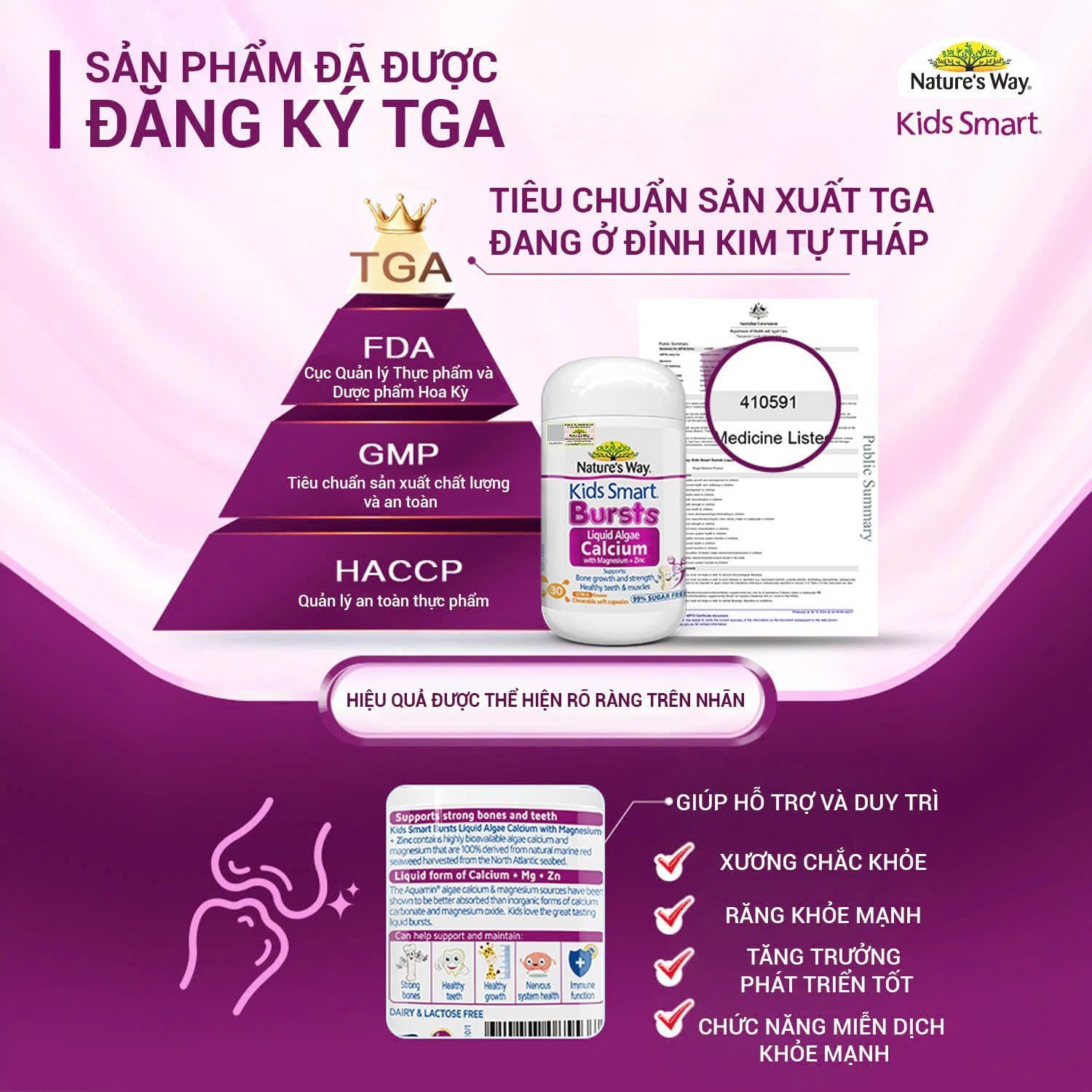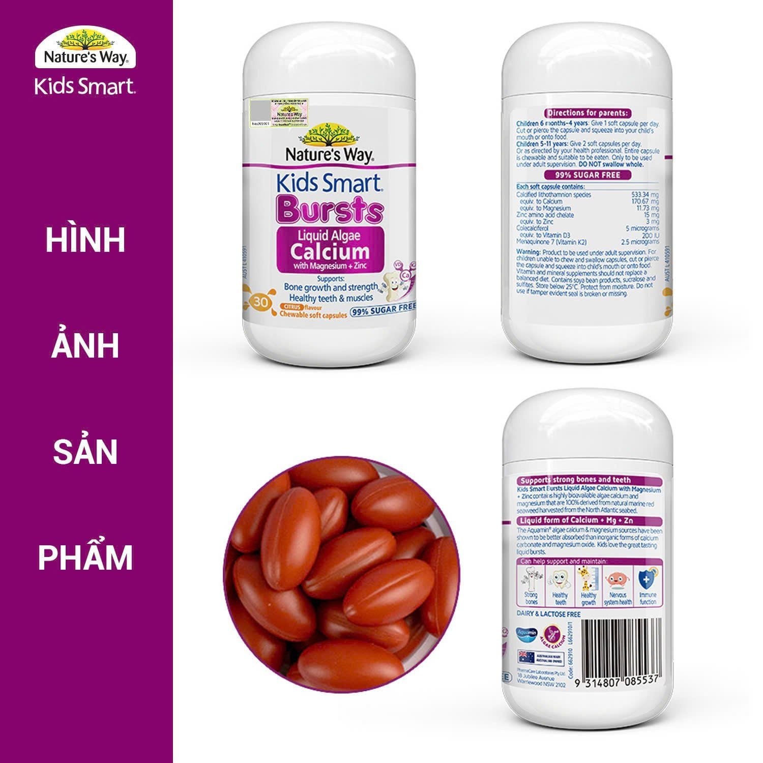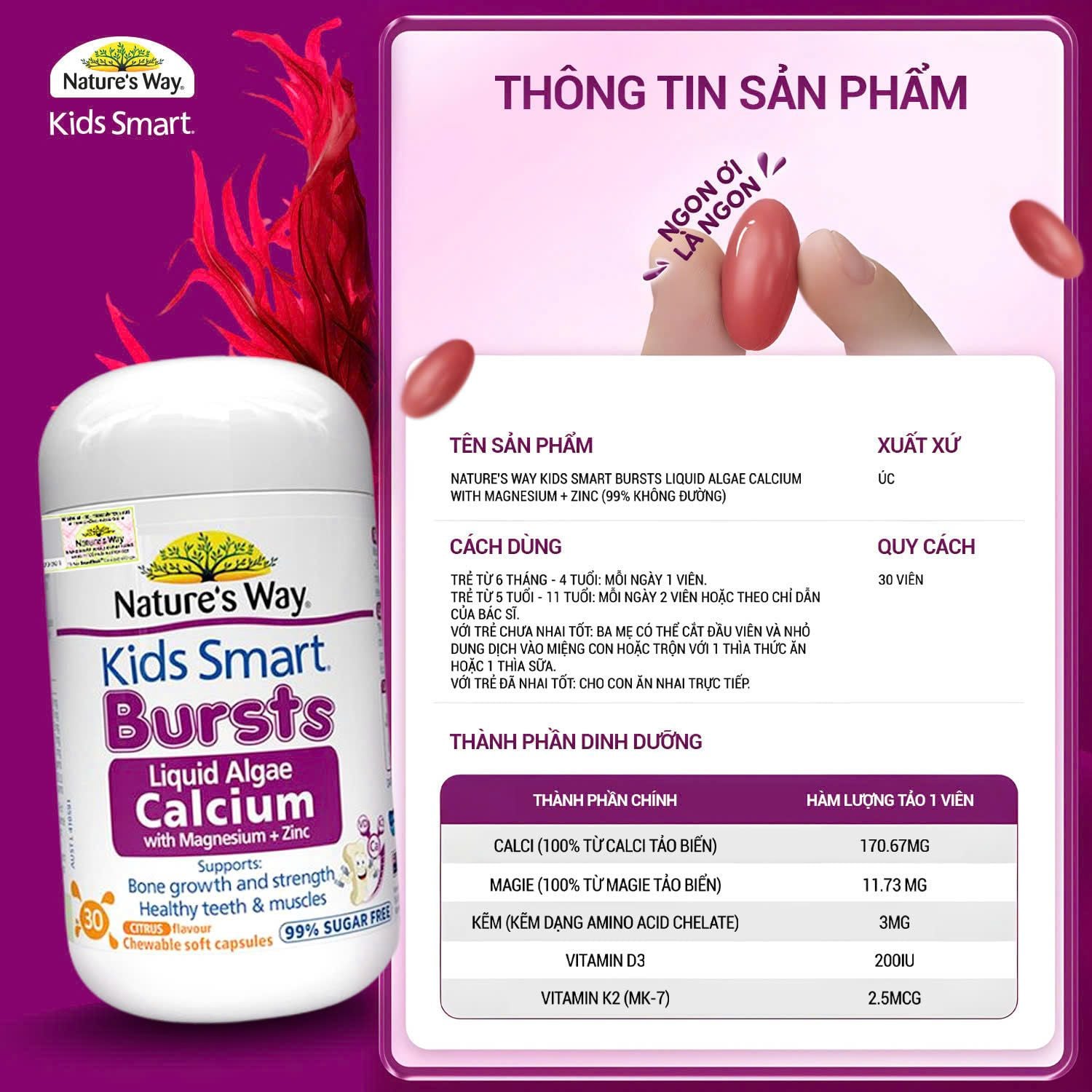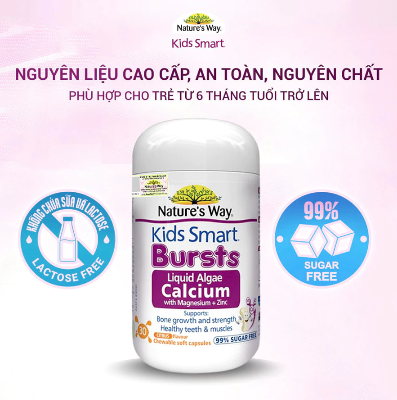 - Viên Nhai Nature's Way Kids Smart Bursts Liquid Algae Calcium With Magnesium + Zinc - Calci tổ ong tảo biển đỏ bổ sung Vitamin D3 + K2 - Hỗ trợ phát triển xương, răng chắc khỏe - 30 viên
